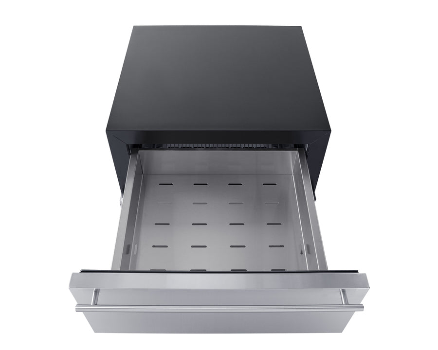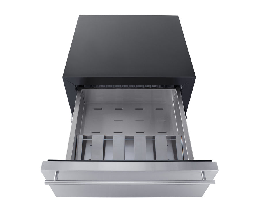 Upper drawer and lower interior walls are constructed from stainless steel for added strength and easy cleanup