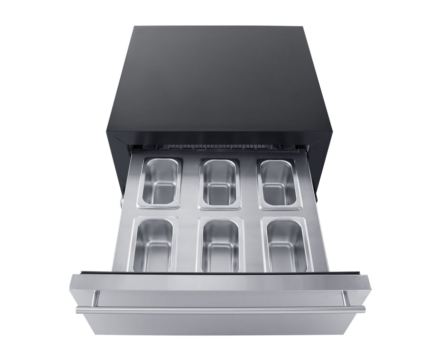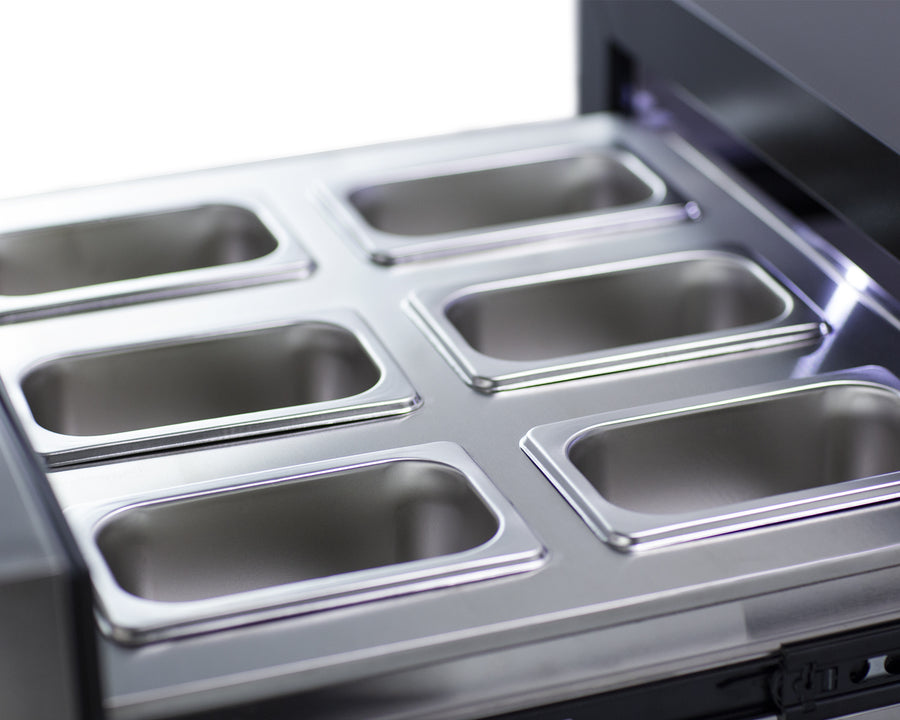 Upper drawer ships with a removable stainless steel tray with 6 cutouts for small steam pans (included) for easy and organized storage of condiments, sealed garnishes, and other popular bar items