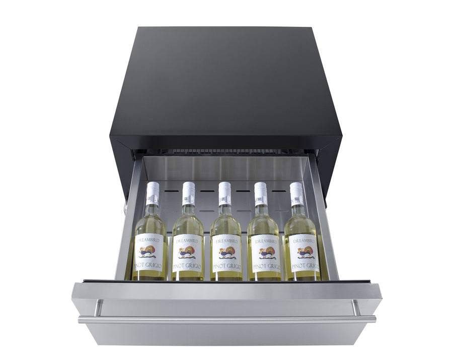 Summit Commercial manufactures unique refrigeration solutions for convenient storage and display in foodservice applications.The SCR615TD is an undercounter beverage center designed to optimize back bar storage, with a combination slide-out refrigerated storage drawer and standard front-opening compartment for an easy display of stored items. This unit is ETL-S listed to NSF-7 for use in commercial settings. It features a front-breathing design that allows built-in installation, while the fully finished black cabinet also enables freestanding use. Matching stainless steel handles offer a professional look. The upper drawer compartment offers over 1 cu.ft. of refrigerated storage with a durable stainless steel exterior and interior. We include a removable stainless steel tray insert with 6 commercial steam table/hotel pans, ideal for making condiments and other refrigerated bar essentials easily accessible to busy foodservice staff. A removable wine rack is also included to stand bottles up at a slight angle once opened. The rack can be temporarily fixed into place with supplied hardware for added stability. The drawer ceiling includes white LED lighting to keep items in an attractive, energy efficient display.The SCR615TD's lower compartment is designed with a traditional front-opening user-reversible door constructed from stainless steel trim and double pane tempered glass. Four white LED lights illuminate the stainless steel interior to keep beverages and other items in full view. Cantilevered shelving allows you to adjust the two chrome shelves to virtually any position to accommodate a variety of sizes. This compartment includes a factory-installed lock.For easy temperature management, the SCR615TD is equipped with a digital thermostat with settings viewable in Celsius or Fahrenheit. Internal fan-forced cooling helps to ensure even temperature distribution throughout the 4.76 cu.ft. stainless steel interior, with no-frost operation to help minimize user maintenance. Additional features include a high/low temperature alarm, open door/drawer alarm, Sabbath mode setting for optional observance, and temperature memory function to recover settings in the event of a power loss. With its durable construction and unique storage options, the SCR615TD makes a versatile addition for any bar, coffee shop, or similar commercial environment.
