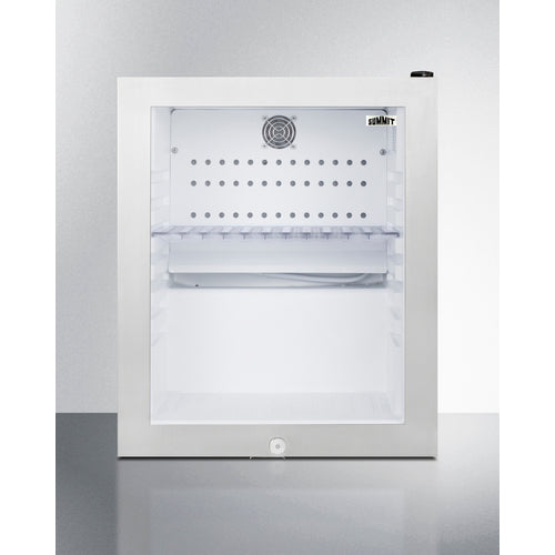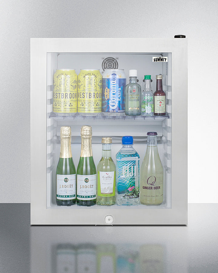 Summit offers a selection of minibars perfectly sized for compact spaces. Sized at under 16 inches wide, the MB13GST is a compact freestanding minibar with a black cabinet finish. The user-reversible double pane tempered glass door features a seamless stainless steel trim for a more deluxe presentation. This unit includes a factory-installed lock for additional security.Inside, the MB13G has 0.9 cu.ft. of storage space and a white interior for brighter visibility of contents. A compressor-based cooling system ensures proper refrigeration to keep stored items cold, while the laboratory-tested operation keeps it quiet with a sound level of 33.5 decibels, sure to not disturb guests' sleep. A removable half shelf, with seven placement options, lets you maximize storage capacity. The LED light illuminates the interior for quick viewing, and the automatic defrost ensures minimum user maintenance. This unit includes digital controls for easy temperature management.With a compact size and user-friendly design, the MB13G is the perfect choice for hotels, offices, and other settings in need of reliable, quiet cooling in a slim fit.