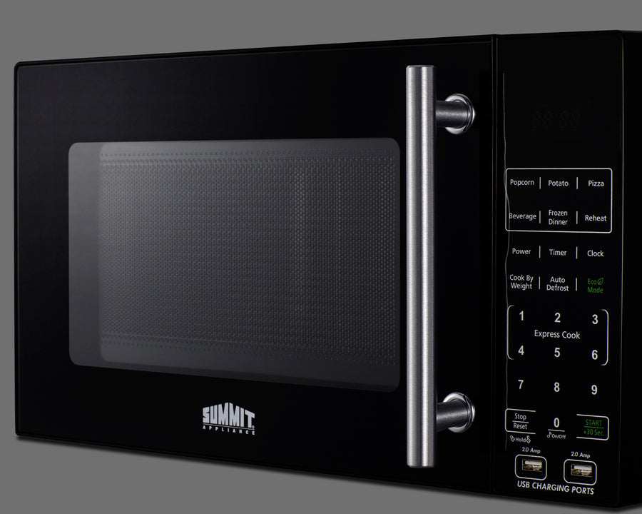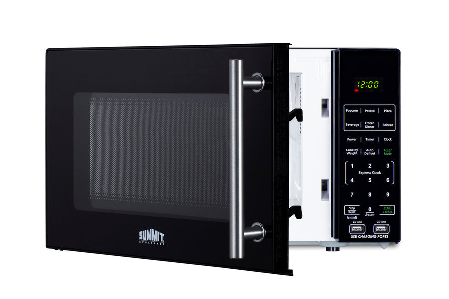 Summit's selection of microwave ovens includes fully featured models specially designed to maximize convenience in residential and hospitality settings.Model SM903BSA1 is a countertop microwave in a jet black finish, with a door window for convenient viewing and an easy-grab handle in brushed stainless steel. The rear features a built-in allocator that accepts a 2 or 3-prong plug, making this unit ideal for 1-cord use with a refrigerator, coffeemaker, or other appliance. The allocator automatically disables the second appliance when the microwave is in use, resuming power after the cycle is finished in order to prevent power surges. Two USB ports are built into the front to allow for charging of mobile devices. The digital control panel features one-touch settings for pizza, potatoes, popcorn beverages, frozen dinners, and reheating. Additional settings let you auto defrost, cook by weight, or add 30 seconds for fast reheating. Multi-stage cooking lets you combine different functions. The digital display can be disabled in eco mode and the end-of-cycle alerts muted at the touch of a button. This microwave features a clean white interior with a removable glass turntable.With its compact size and innovative power-saving design, the SM903BSA1 offers convenient benefits for a variety of locations.
