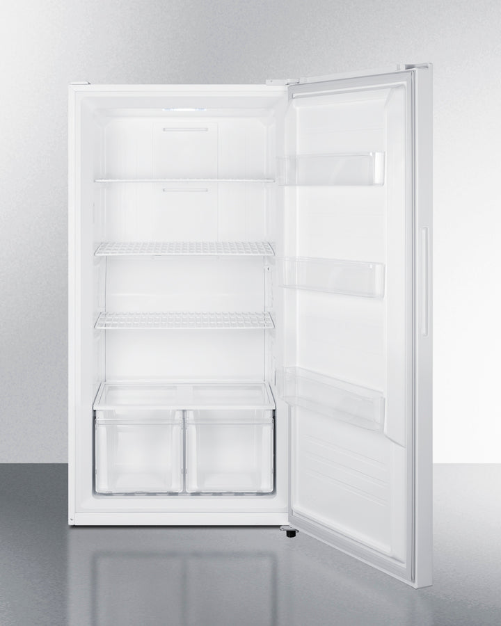 Three wire shelves allow users to rearrange the freezer space to fit any sized item or remove shelves for simple cleanup