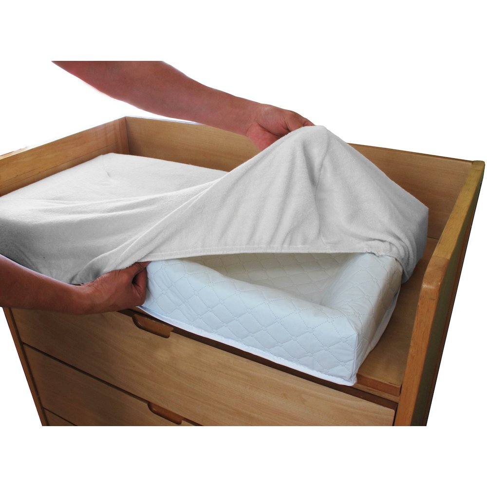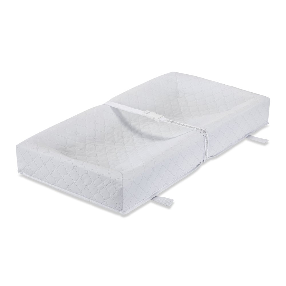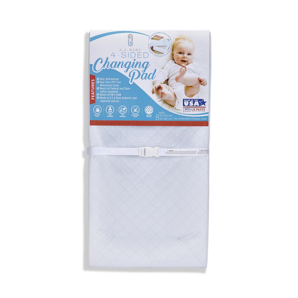 L.A. Baby's 4 Sided changing pad has four 4'' high sides to keep baby safe and has an overall size of 30'' x 16'' x 4''. Features a non-skid bottom that prevents pad from sliding while changing baby. The quilted outer cover has a dust mite barrier, is hypo-allergenic, anti-microbial, non-toxic and made of a PVC free material. This outer cover material is also stain resistant, waterproof and easy to keep clean with mild soap and water that helps make sure your baby's sleeping environment stays healthy and sanitary. Safety harness for baby with a quick release buckle. Includes security strap for holding changing pad to changing table or dresser top. A separate fitted white terry cover is included in this 4 sided pad and terry cover combo pack. Made in the U.S.A. from domestic and imported materials. Product Specs: Product Height:
