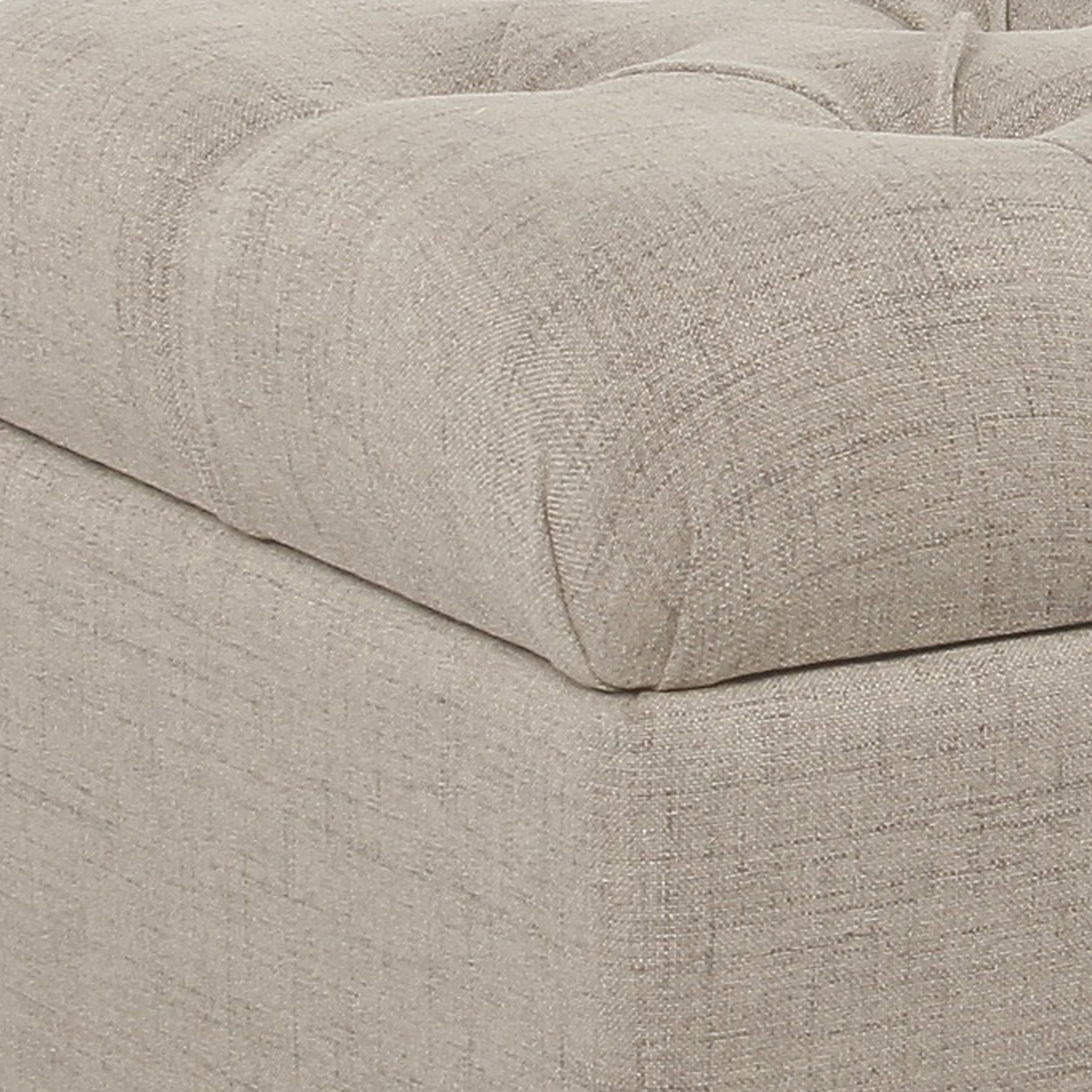 A deliberately designed upholstered bench will add a flair of style and contemporary storage to hide extra commodities in your living room. Constructed from plywood and wood with soft textured beige color polyester fabric upholstery, this bench features hinged lid storage and button tufted detailing, giving it a unified design. Use it as an entryway bench, bedroom bench or you can also place it in your home office to offer extra seating. Tapered wooden feet in dark walnut brown finish, giving greatest support and sturdiness to its design.
