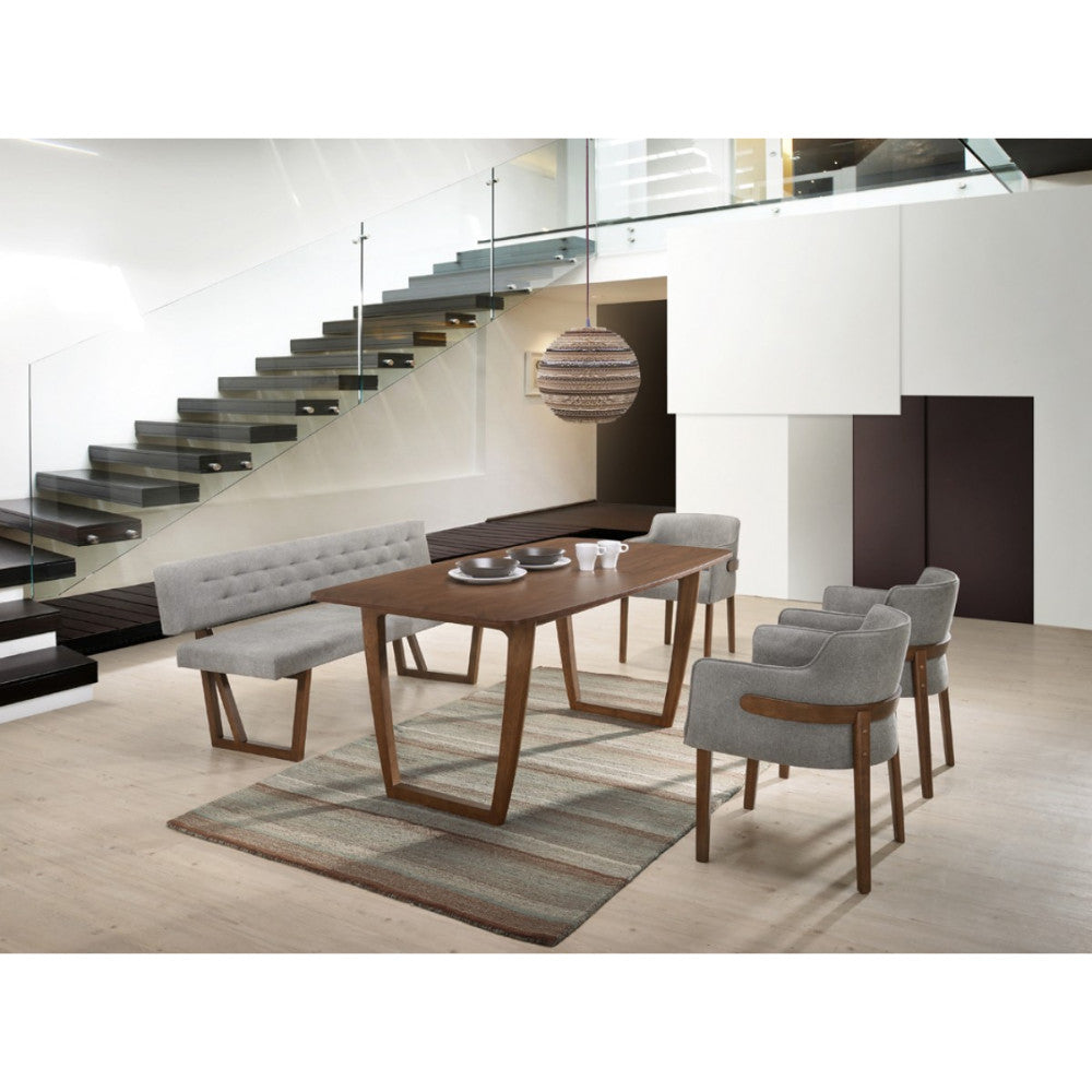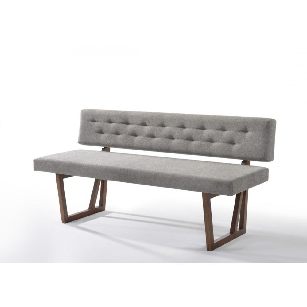 A deliberately designed upholstered bench will add a flair of contemporary interpretation of modern design to your dining area and breakfast nook. Constructed with rubber wood, gray color polyester fabric upholstered seat, back rest design giving it a unified design. The back of bench also features a button tufted detailing in two rows with airy back towards bottom to give additional comfort. Geometrical walnut brown finish feet are giving greatest support and sturdiness to its design.