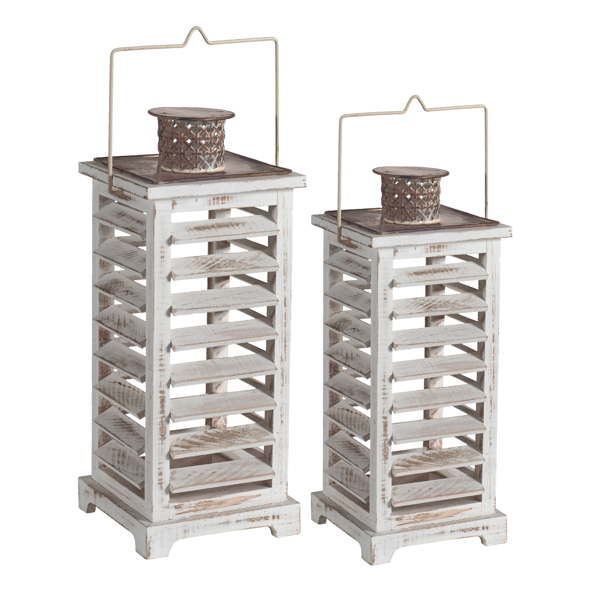 This set of two lanterns will illuminate your home with its warm glow. Constructed from durable wood in washed white, these lanterns feature louvered design and ornate metal details on top for a rustic look. Each lantern is fitted with a metal handle for you to easily carry or hang them wherever and whenever needed. Just place you favorite candle inside these Lanterns and create an inviting atmosphere for your special indoor or outdoor area.