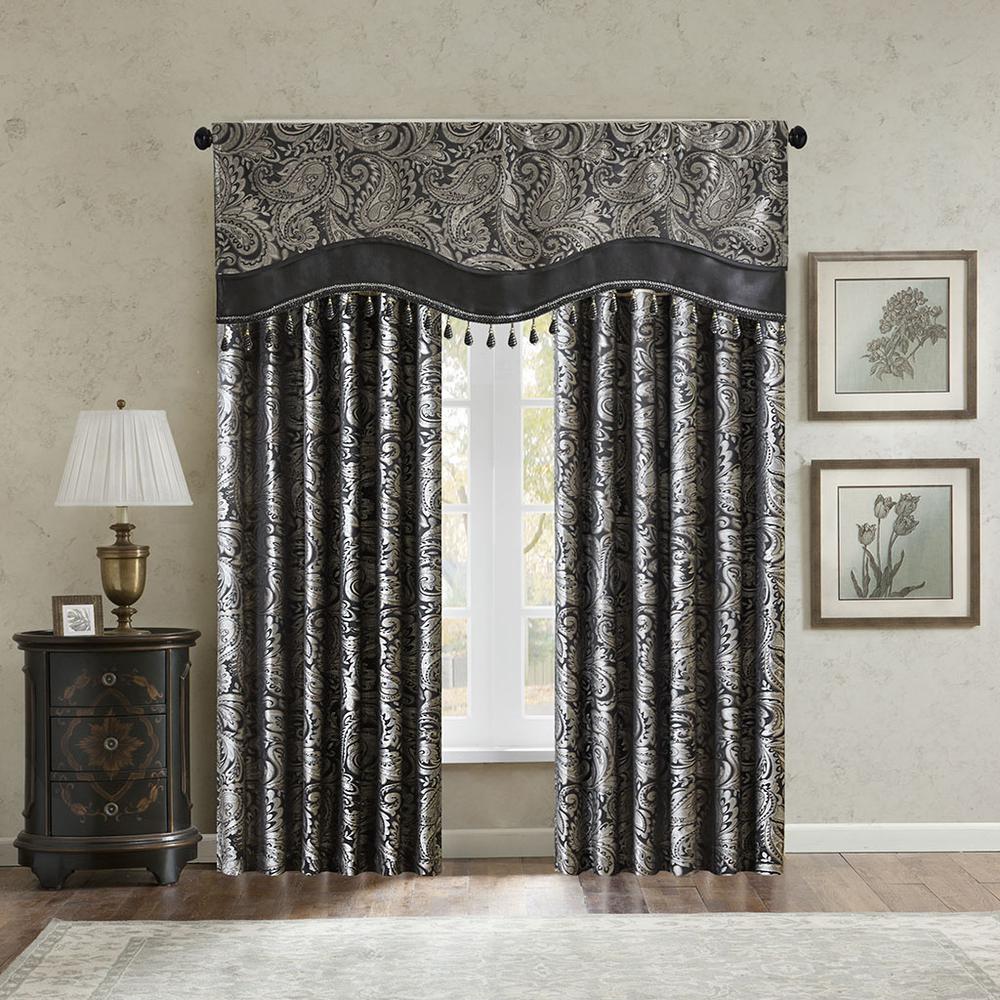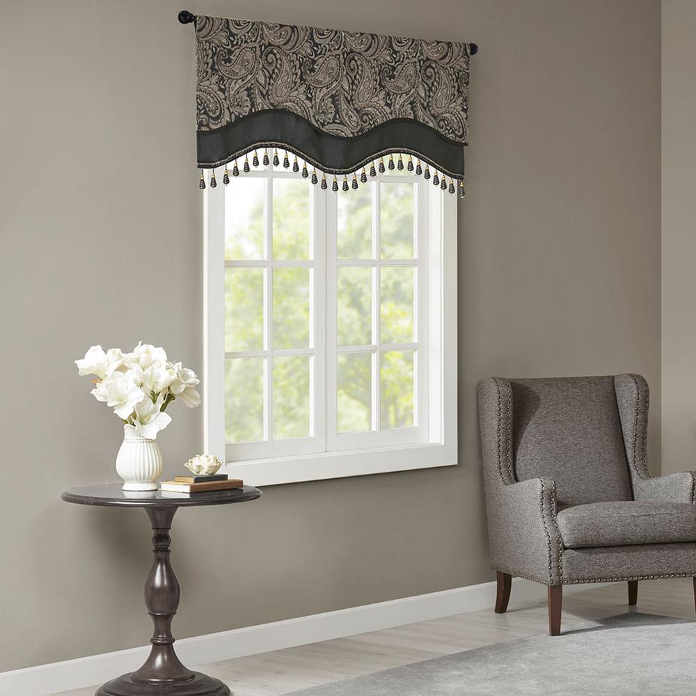 For a unique and luxuriously classic style, our Madison Park Aubrey Beaded Valance is the perfect extra touch to your decor. The alluring jacquard weave is inspired from an updated paisley motif and is woven in beautiful hues of black, gold, and a hint of silver for a shimmering accent. The window valance features solid faux silk piecing and flat piping details, while delicately finished with a scalloped bottom design and intricate gold bead trim, creating an intriguing elegant look. This window panel is also OEKO-TEX certified, meaning it does not contain any harmful substances or chemicals, ensuring quality comfort and wellness. Simply hang on rod pocket; fits up to a 1.25 diameter rod.