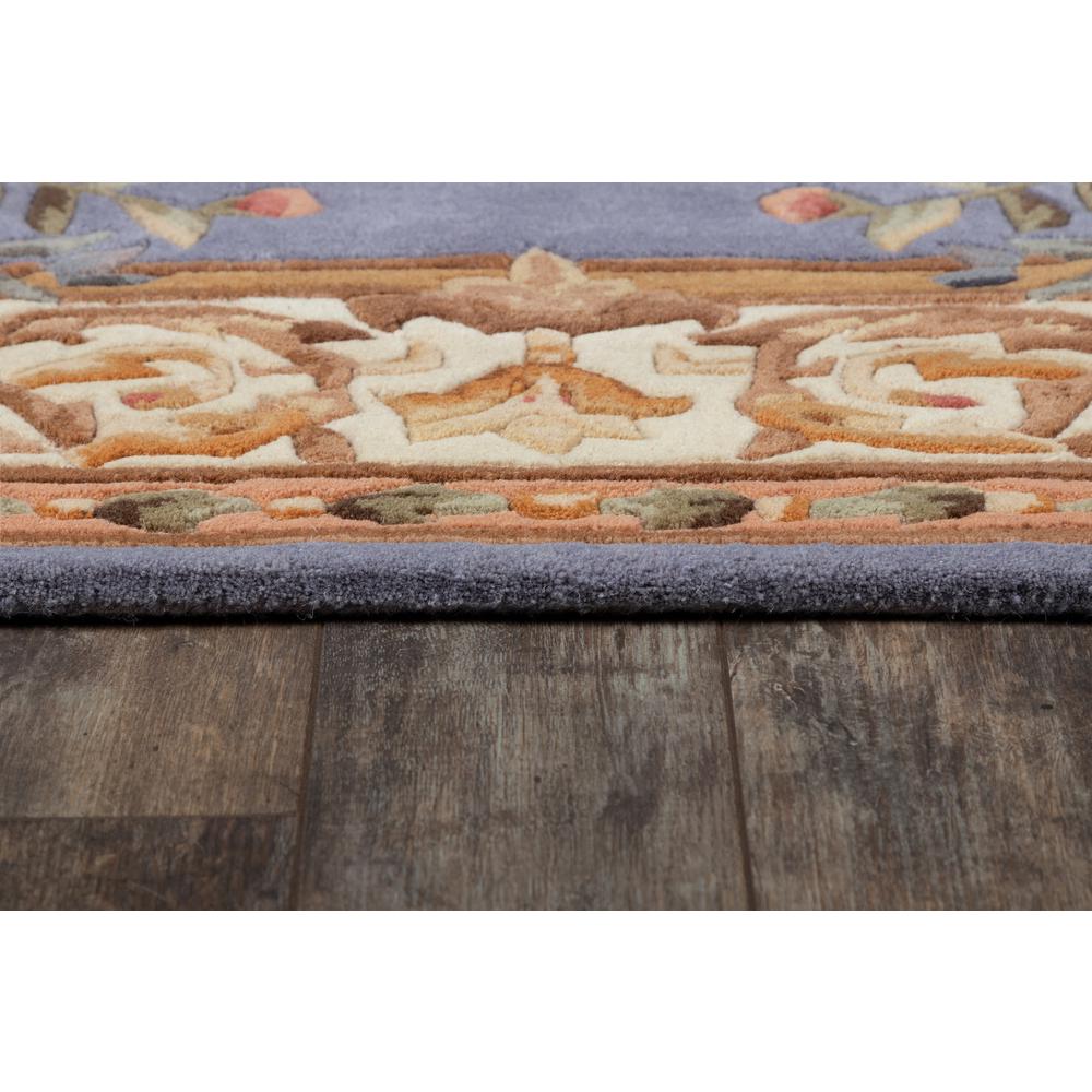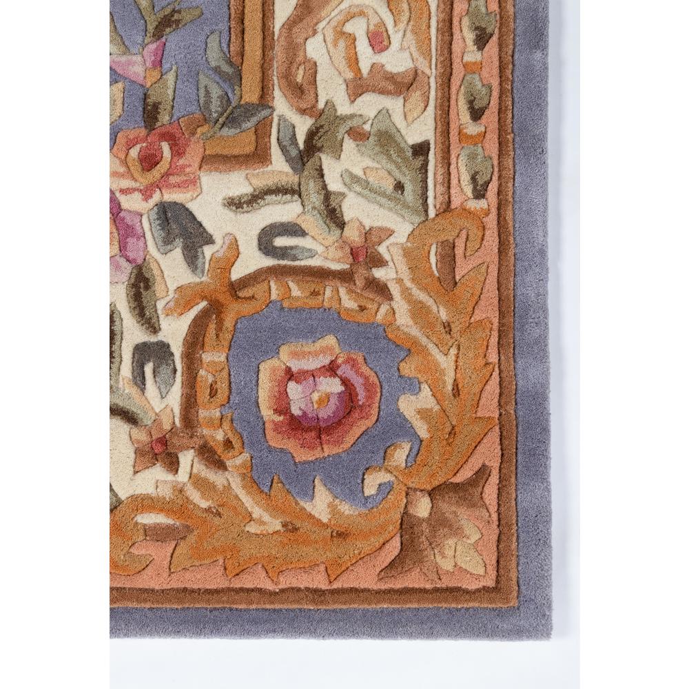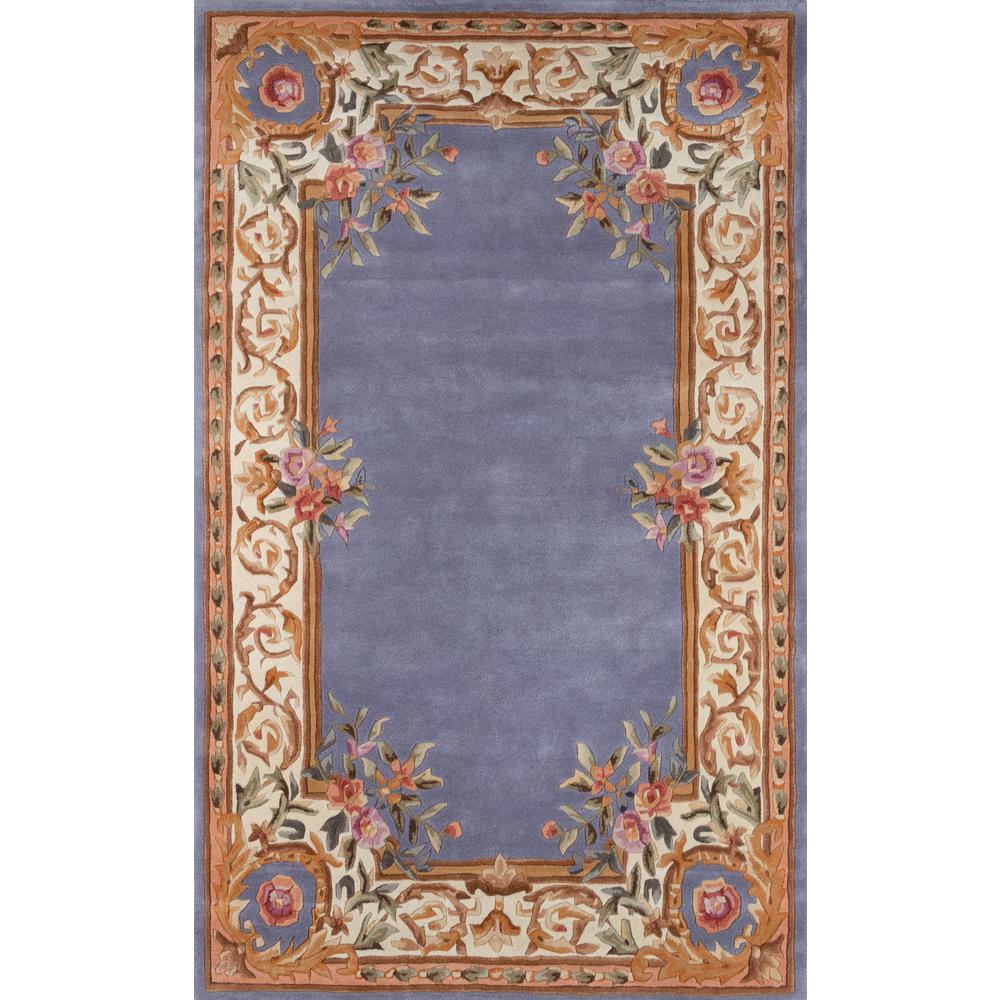 The antique-style embellishment of this traditional area rug adds ornamental flourish to floors throughout the home. Available in royal shades of sage green, soft blue, ivory, rose and regal burgundy red, the ornate gold scrolls and scallops of each decorative floorcovering reflect the gilded grandeur of French baroque style. Hand tufted from 100% natural wool fibers, the curling vines and lush floral bouquets of the borders are hand carved for exquisite depth and dimension.