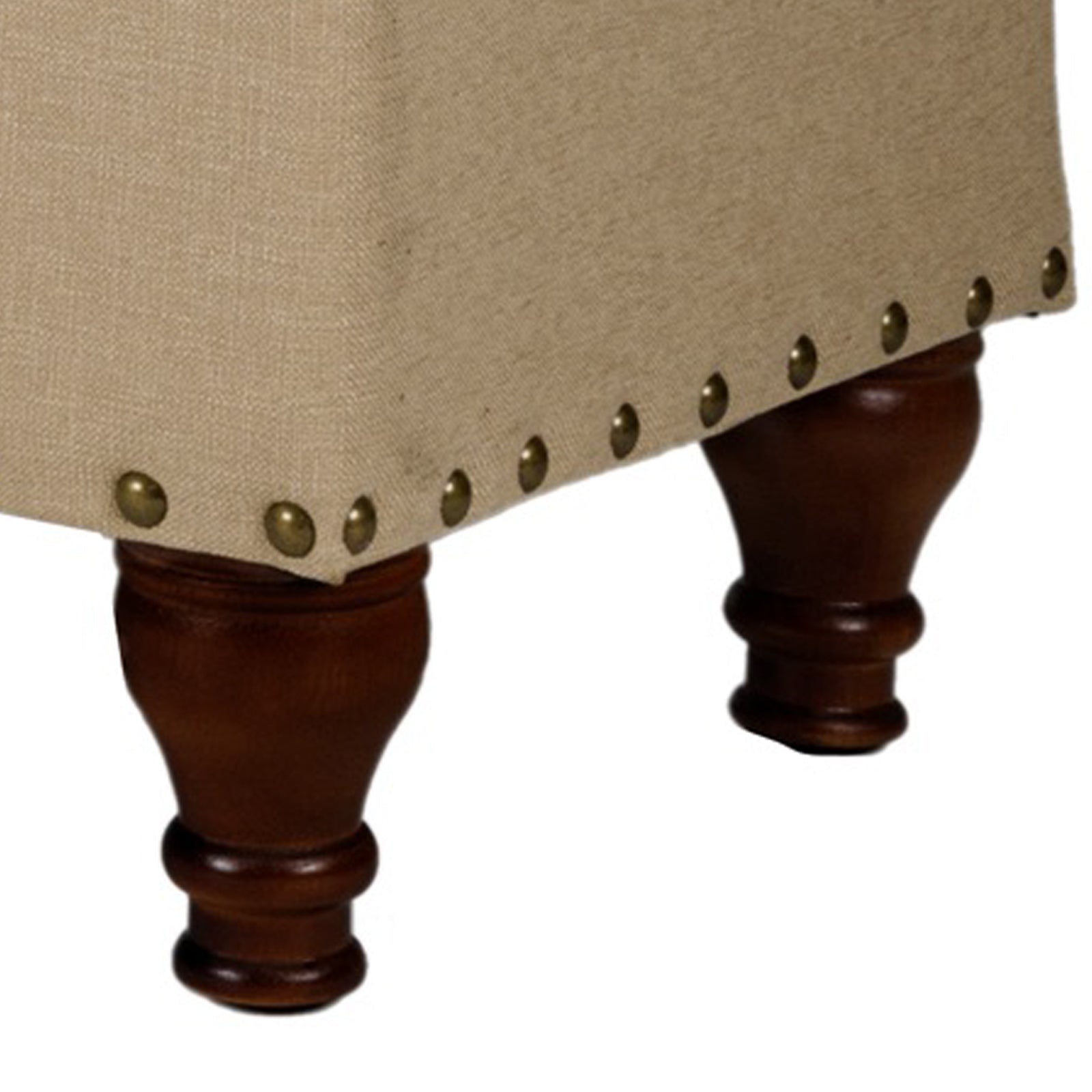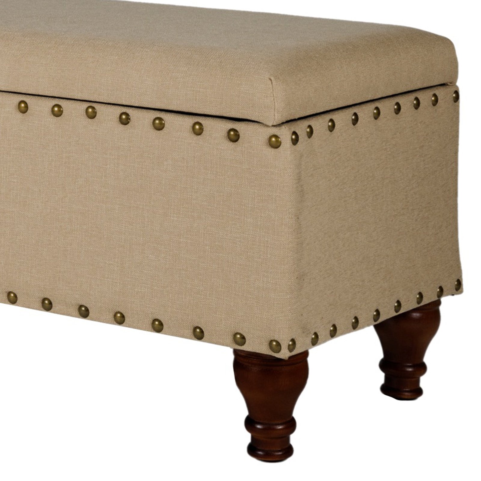 This beautiful design bench will perform multiple functions in your home setting. Made up of quality wood and plywood with the tan brown polyester fabric upholstery, this large-sized bench will add style and storage to any room in one go. It also features timeless look with nail head trim, hinged seat storage and turned wooden legs in a brown finish. This rectangular bench can be used as a dining bench when extra seating is needed or as an entryway bench to store accessories or hide shoes.