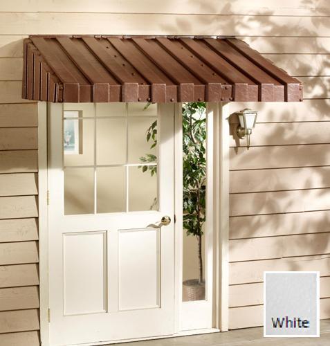 Window Awnings are available in eight (8) sizes. Door Canopies are available in three (3) sizes. All units are available in three (3) colors to blend with house colors. Brown, Colonial Blue and White.