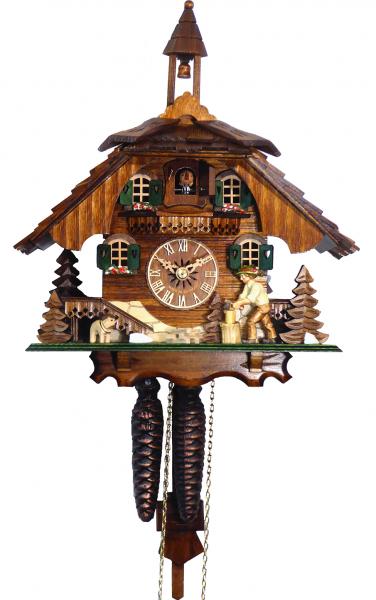 Cuckoos and gongs once on each half hour and number of hours on the hour - and the woodchopper raises and lowers axe