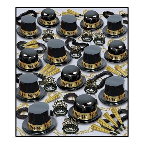 Let's get the show on the road! If you plan on having a large New Years Eve party, whether it is for friends and family, an office party or even a bar or club that is open over the holidays, this Showtime Gold Assortment is perfect for your event. Filled with enough hats and party favors for one hundred (100) people, this kit will satisfy all of your guests. Within this part kit you will receive twenty-five (25) plastic toppers, twenty-five (25) plastic derbies, fifty (50) glittered fringed tiaras, one hundred (100) foil party horns, twenty-five (25) party beads and twenty-five (25) soft-twist poly leis. Each item is decorated in only black and gold so you don't have to worry about anything looking out of place. Your guests will have an amazing night, but make it unforgettable by having this Showtime Gold Assortment.