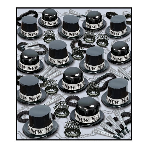 Save time and money by getting this Showtime Silver Assortment for one hundred (100) people to have at your New Years Eve party. This party kit contains everything you need to have an unforgettable party. Each item is designed in only black and silver, so it all matches perfectly; you don't have to waste any time searching for coordinating hats and party favors! Take a look at all of the Party Kits for 100 to find the perfect set that goes with your party theme.