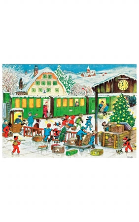 Train station with people boarding their luggage on a train to go on a ski vacation.