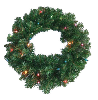 Holiday Wonderland, 24", Mixed Needle Artificial Wreath with 150 Tips, 50 Multi Color 3 mm LED Lights, Battery Operated, Timer Feature, On 6, Off 18 Hours, Uses 3 "AA" Batteries, Not Included.