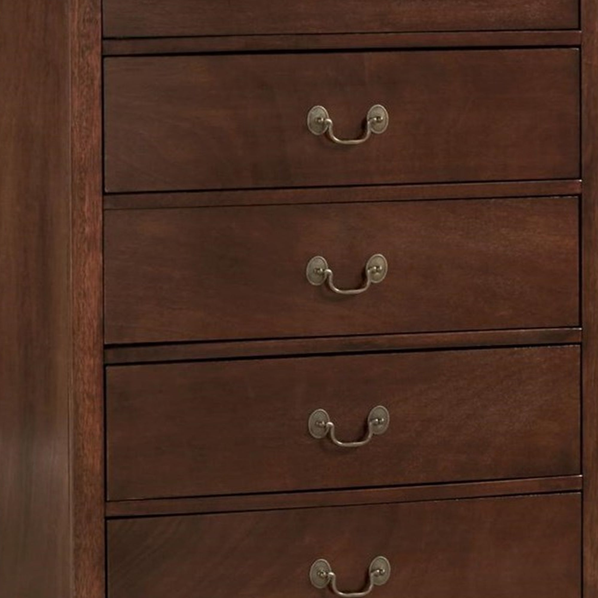 Create an elegant and traditional look for your space with this 5 drawer wooden chest. It features traditional flare, antiqued metal bale hardware, distinct framing of the drawers and cherry brown finish, which make this chest perfect addition to any room. It has 5 drawer which provide enough space for your needed storage items.