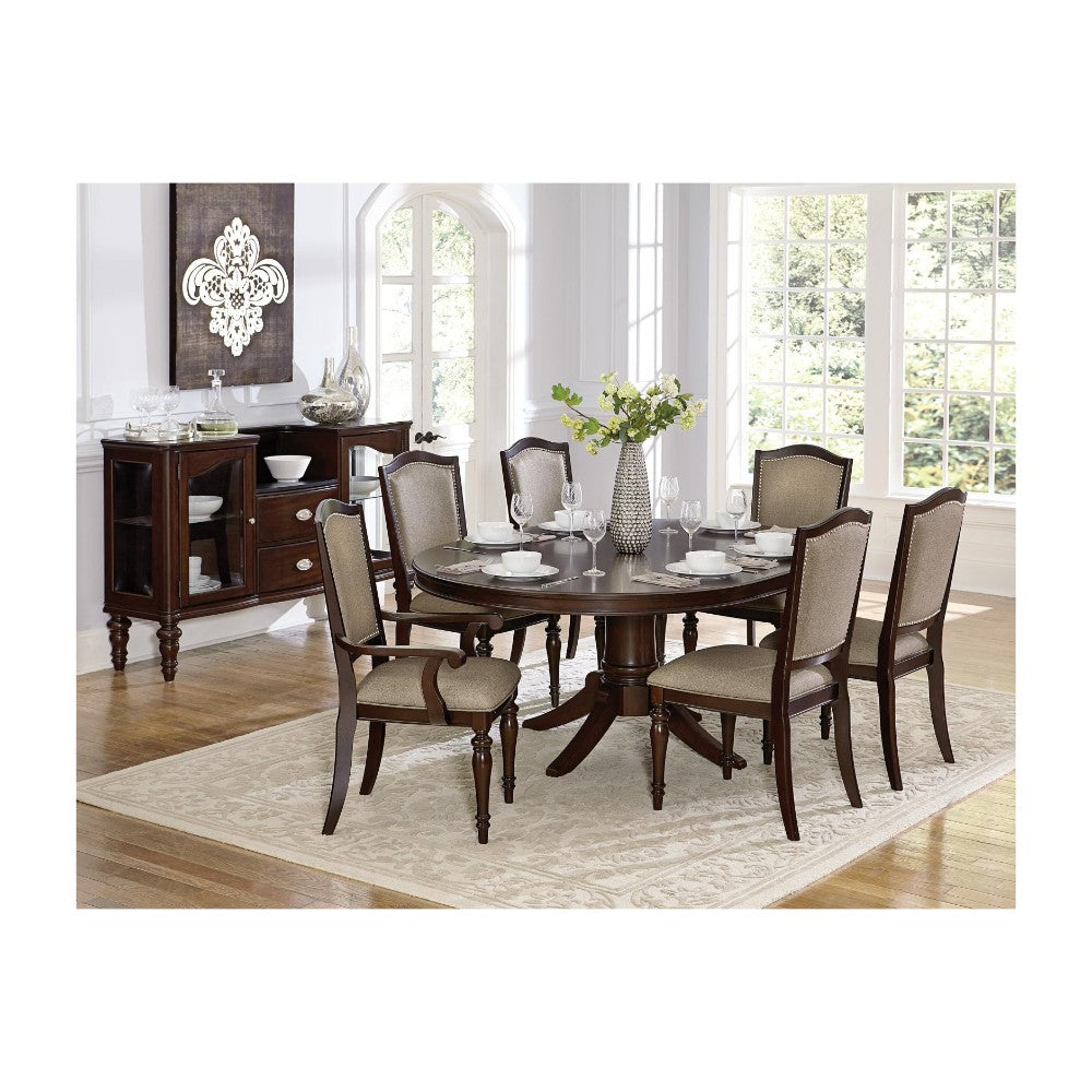 Exquisite traditional style arm chair is very beautiful and elegant in looks and great at comfort. The solid wooden frame in brown finish has been upholstered in light shade fabric creating a contrasting effect. The chair has nail head accents on the back support and lovely turned legs. You can accord it with smart dining table for a complete look.