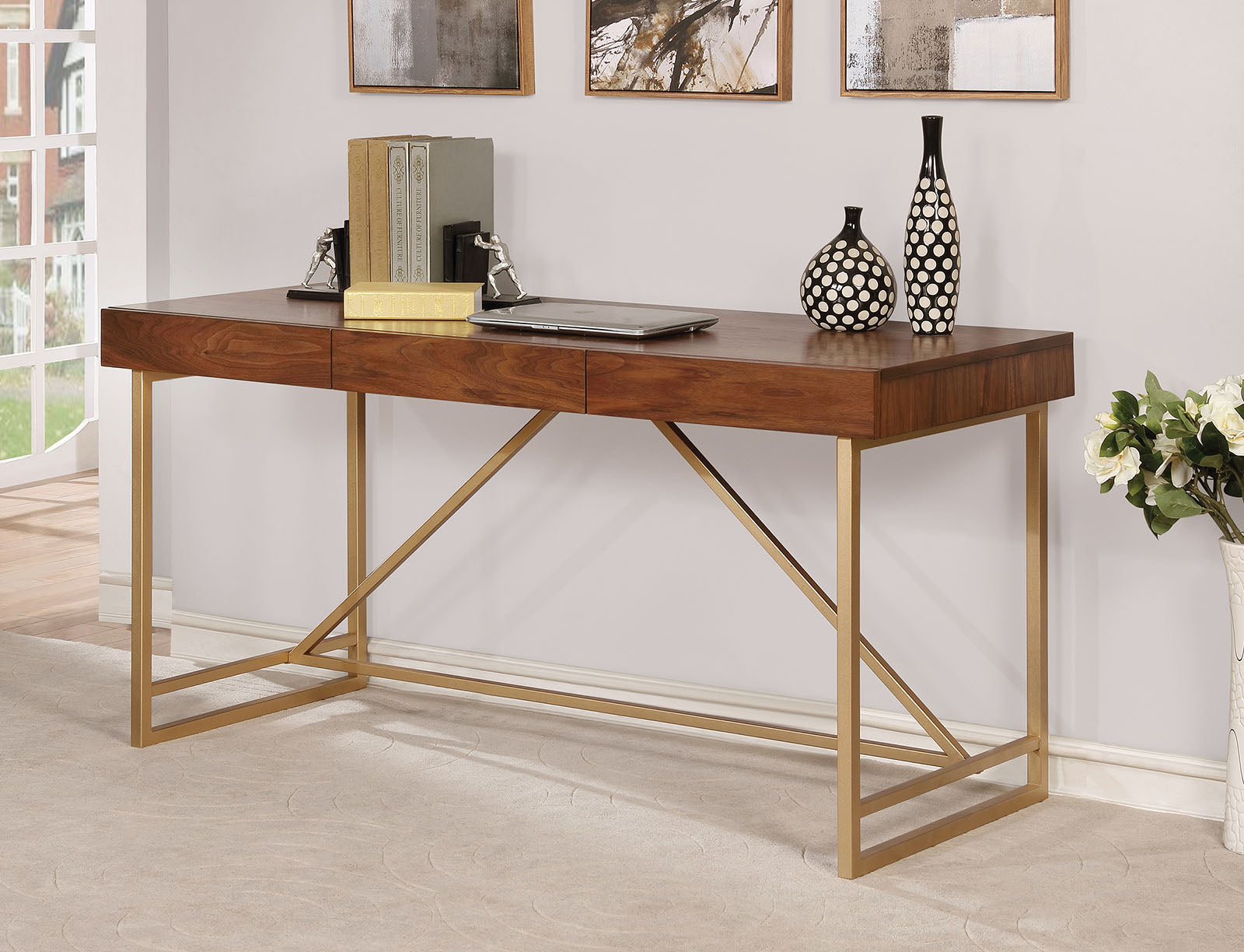 Upgrade your home or office decor with this writing desk. It features walnut brown finished top and is accented with metallic gold finished unique metal legs for an appealing look as well to have good support base. The smooth top of the desk is ideal to display picture frames or table accent items. It also has three spacious drawers will store all your office supplies and keep the top clutter free. It can be use as a writing or working desk for your home office and also can be placed in entryway as accent table. This piece of furniture will bring classic appeal to your decor and will enhance the vibe of the interiors.