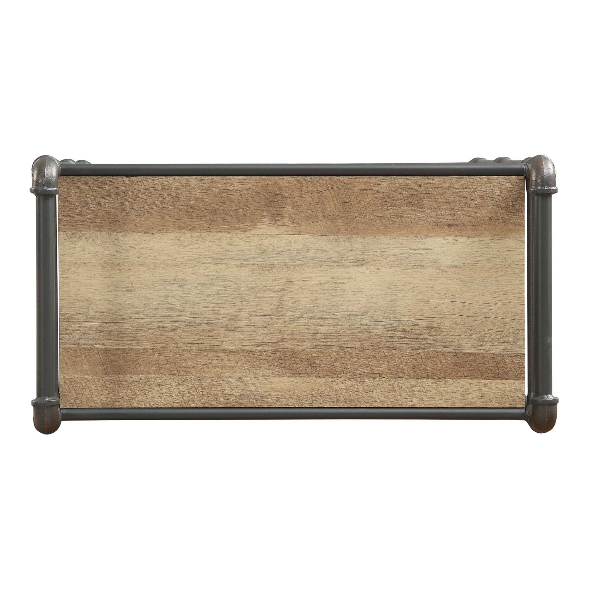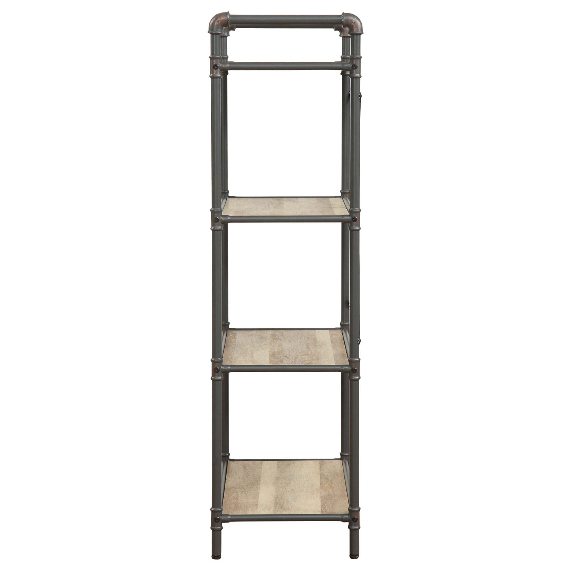 A utilitarian take on modern design, this Four-Tier Bookshelf bristles with versatile style. This piece is crafted from a mix of wood and metal and showcases an open design for a breezy look. Pipe details give this bookshelf an exposed factory-inspired aesthetic, while distressed accents outfit the piece in antiqued influence. Each tier features an oak brown hue, paired with the frame's sandy gray finish for a two-tone palette. Perfect for displaying favorite hardcover novels or framed family photos.