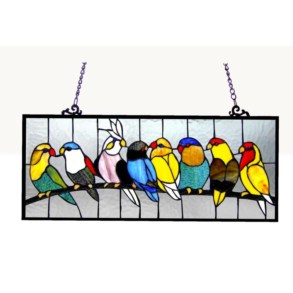 Hand crafted glass window panel featuring colorful birds lounging on a branch. Each bird designed with intricate cut glass and touches of color. This glass piece is adorned with a metal frame coated in a vintage patina with designed anchors. Wonderful addition to any window. Only top quality materials used in this piece. Product Specs: Product Height: