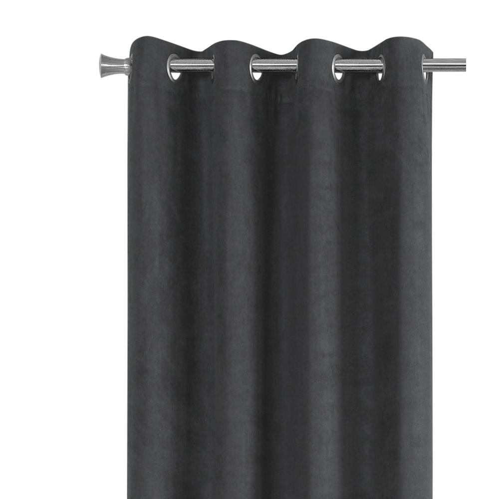 Add an elegant finishing touch to a room with this set of two room darkening curtain panels in a soft micro-suede finish that is machine washable. Each 54W x 95H curtain panel incorporates room-darkening material to help filter out the light giving a quiet peaceful retreat to a room. The 8 silver metal grommets on each panel makes it a quick setup and the extra long and simple classic lines of these grey curtains are versatile enough to hang in a living room bedroom or dining room. Curtain rod not included and must be purchased separately. Product Specs: Product Height: