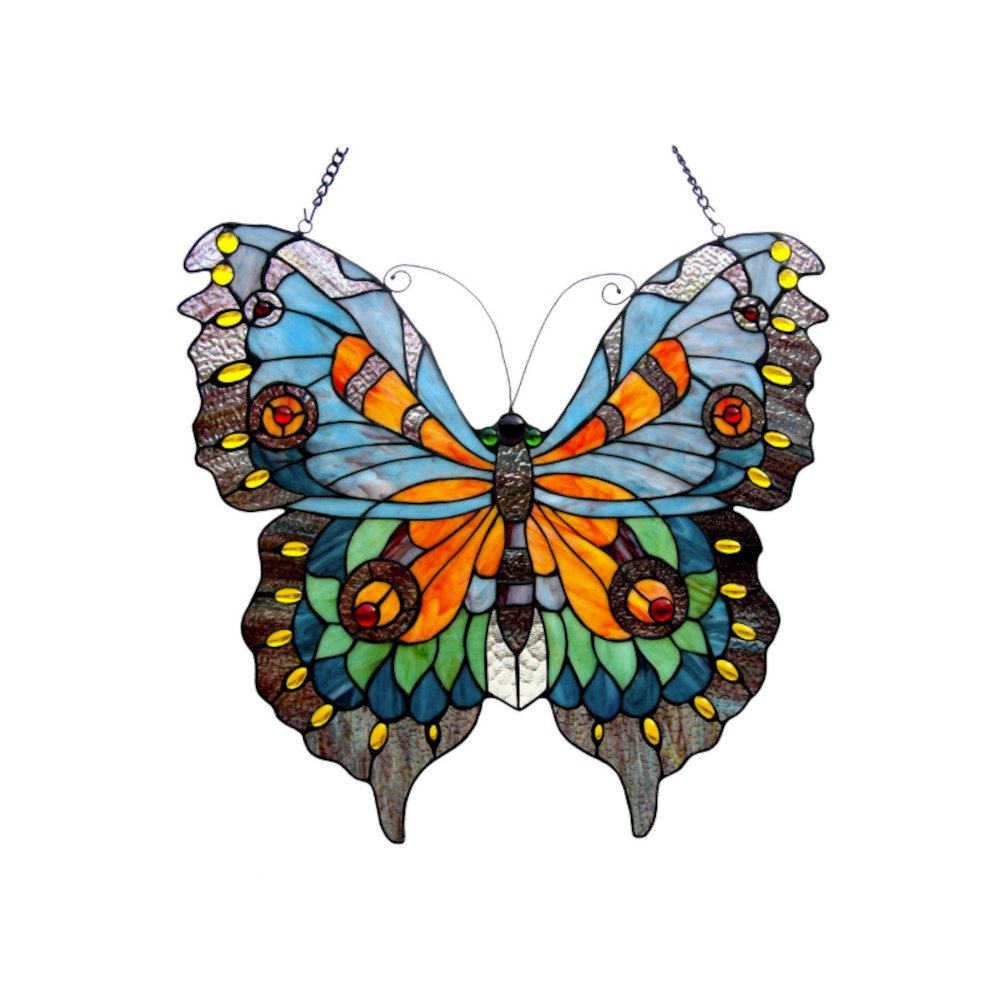 MARIPOSA, your home's decor soars to graceful new heights with the Tiffany-Style Butterfly Window Panel. The delicate wings feature stunning textured glass. This butterfly-shaped panel is sure to add a splash of color to any room. The stained glass panel is crafted with 186 pieces of glass and 85 cabochons, the colors within this piece are bold and sure to attract attention.