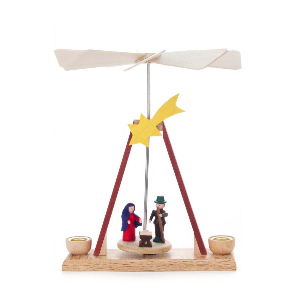 Dregeno miniature pyramid - Nativity scene in natural wood finish turns when candles are lit - made in Germany. - use our #29319 red or #29320 white candles. Product Specs: Product Height: