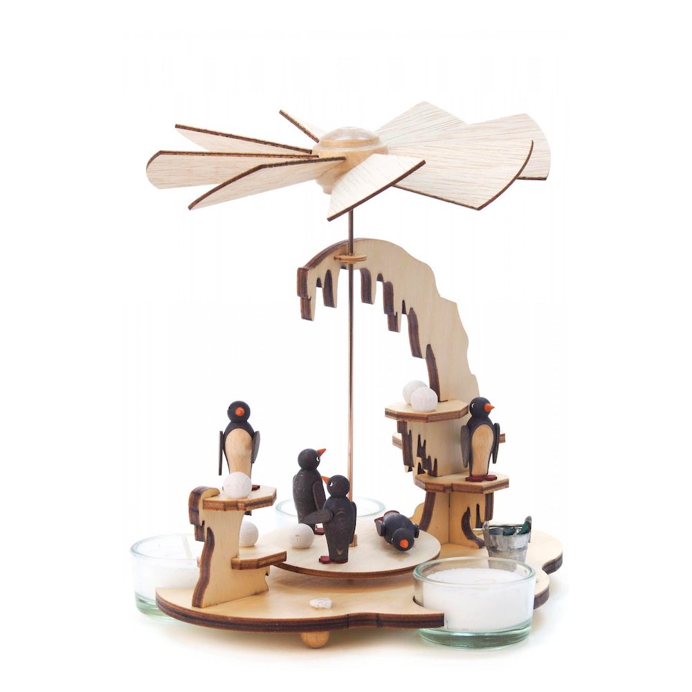 Dregeno miniature pyramid - Penguin-fest with snowballs and bucket of fish - blades turn by the heat rising from the candle light - uses 2 tea candles (see our #12-3815-P) made in Germany - use 3 tea candles.