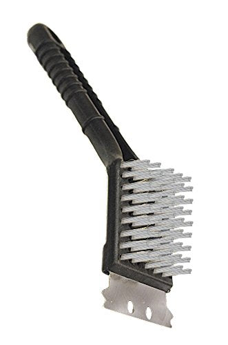8" overall length. Stainless steel bristles with metal scraper. Heavy duty, long plastic handle. Safe for cleaning porcelain and chrome grids.