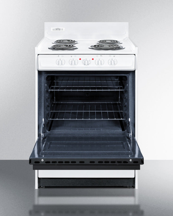 Summit Appliance offers a wide selection of American-made household ranges built for long-lasting durability in space-challenged kitchens. The WEM630DK is an apartment-sized 220V electric range sized at just 24'' wide, with a generous 2.92 cu.ft oven interior that can accommodate large trays. The black glass oven window and interior light with an on/off switch make it easy to monitor your cooking without opening the door. Two adjustable oven racks are included. The waist-high broiler is located inside the oven, allowing you to switch functions without moving contents to a separate compartment on the floor. The lower drop-down storage compartment is ideal for keeping pots and pans out of the way in small kitchens. Designed to meet the most current UL safety standards, this unit features one 8'' 950W and three 6'' 650W coil elements. These operate at lower wattage than standard electric ranges, allowing for a slow but steady heating process that will not cycle off. Upfront push-to-turn knobs offer additional protection, ensuring users won't reach over hot burners to adjust the heat. This unit complies with ADA guidelines.The WEM630DK comes in a classic white finish to suit any kitchen. It has a recessed oven door and is conveniently sized at just 24'' deep for a better fit in galley in L-shaped kitchens, where every inch counts. Porcelain and steel construction help the unit hold up to years of daily use. We include an anti-tip bracket for added safety. This unit does not include a line cord (a standard 40 amp 3 or 4-prong cord can be installed by your electrician). With its classic style and quality construction, Summit's made in the USA cooking line offers reliable cooking for smaller homes. Additional choices are available in 20'', 30'', and 36'' wide fits.