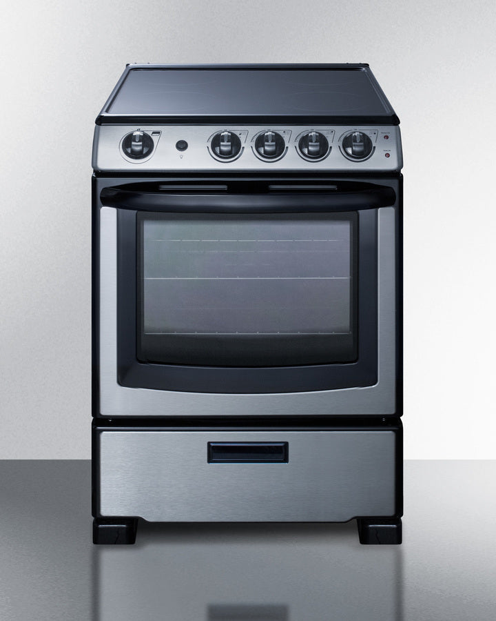 Oven door, storage drawer, and control panel feature a stainless steel finish