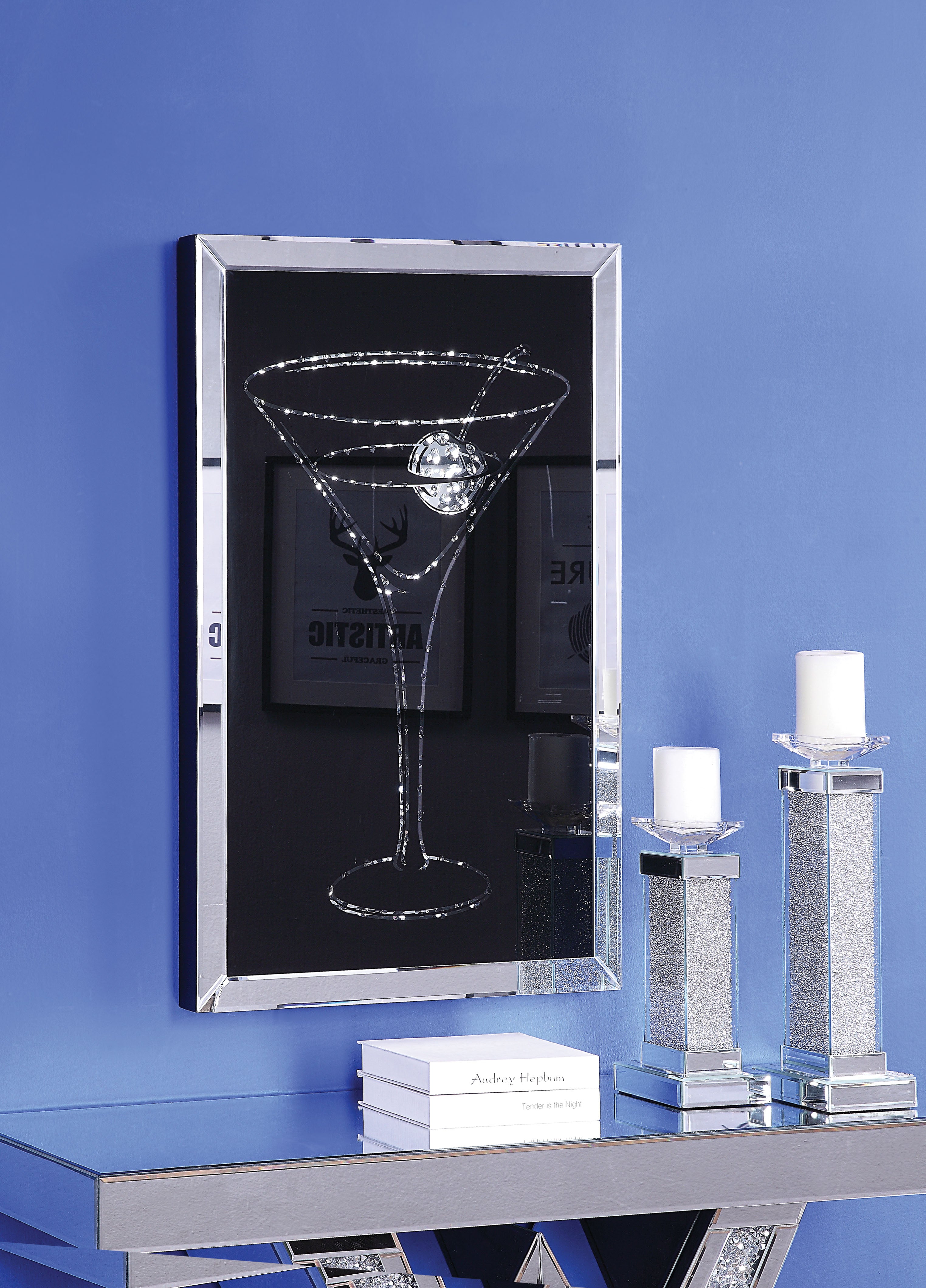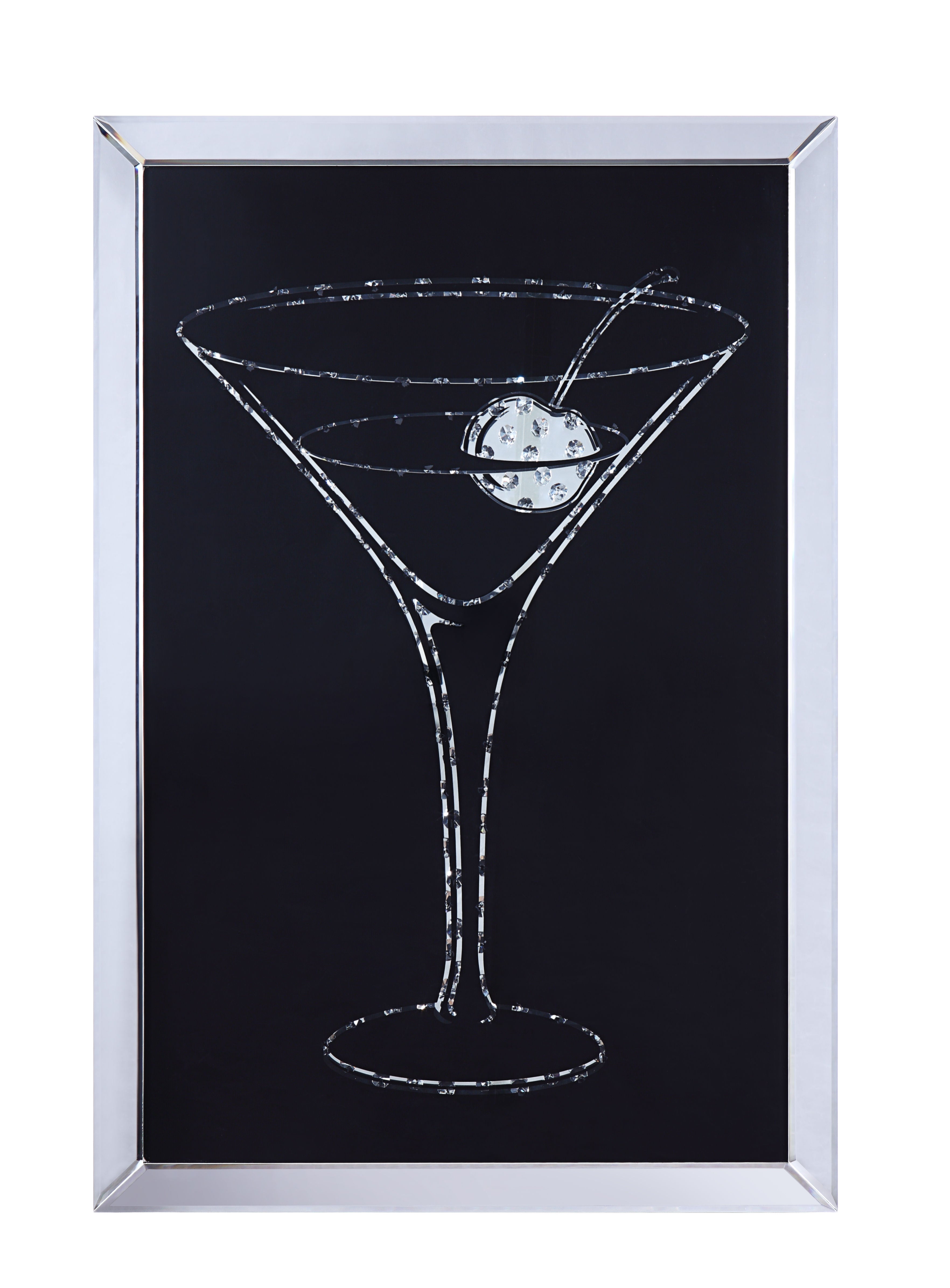 Add interest to your living space with this elegant Martini Glass wall art. The dramatically casted classic cocktail in a martini glass mirror is the perfect contrast against its black background. Faceted optic glass faux crystals adorns the glass and the cocktail, layering it with added luxe and brilliance. To complete the look of this wall art, a beveled mirrored border frames the piece and creates an intricate play of light and refection. This wall art is sure to be the focal point of any room. Note: Other featured items in image except this wall art are sold separately.