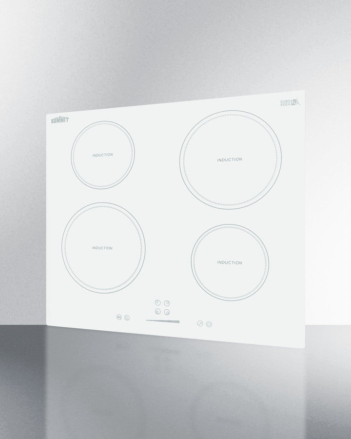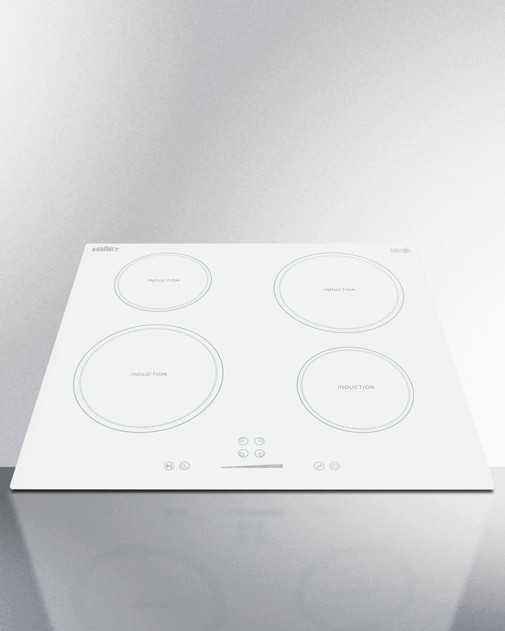 Enjoy the ease, speed, and safety of induction cooking with Summit's selection of energy efficient induction cooktops.The SINC4B242W is a 4-zone induction cooktop designed for use with 208-240V power sources. It comes in a popular size ideal for smaller kitchen spaces, including hotel suites and studio apartments. It is designed for installation in common cutouts sized at 21 7/8'' W x 19 5/8'' D. This unit requires professional installation (cord not included).Smooth white glass made by EuroKera creates an attractive, easy-to-clean surface. The front left and rear right elements are sized at 8 1/4'' and operate at 2000W, ideal for boiling large pots of water or cooking with woks and other large cookware. The rear left and front right 1500W elements are sized at 6 1/4''. The smart burner layout helps provide plenty of room so that larger cooking vessels are spaced apart, making it easier to use all four elements without cookware colliding.Centered upfront for convenient use, the touch controls allow intuitive operation, with a slider control panel that makes it easy to adjust your heat. The digital display shows which elements are in use and their power setting. Audible beeps sound when the touch controls are activated. This cooktop is equipped with a child lock that allows you to disable the controls to prevent unintended heating. A ''stop & go'' function allows you to immediately turn both zones off if needed, with the last settings resuming when reactivated. This unit also includes a timer function that lets you program a power level and cook time (up to 99 minutes) that can either turn the unit off when complete, or serve as a visual countdown with an audible alert when the set time has been reached. Safety features include automatic shutdown, overheat protection, and overflow protection, which will temporarily disable the power if boiling liquid touches the control panel. With its ideal size and advanced safety features, the SINC4B242W is the perfect cooktop to ensure intuitive, safe cooking in a variety of small kitchen settings. For this unit in a black finish, see the SINC4B241B. Additional choices are available in smaller and larger sizes, as well as radiant and coil styles. Browse the full Summit line for more options. NOTE: Induction cooling utilizes magnetized energy that starts inside the cookware, meaning the temperature of the actual cooktop surface does not get nearly as hot as traditional gas or electric elements. Most of the heat is retained inside your cookware, making induction technology the most efficient heating method for your kitchen. Because induction cooking requires magnetic energy, your cookware must be made of cast iron, steel, or magnetic stainless steel. Materials that will not work include aluminum, copper, and non-magnetic stainless steel. Many of your current pots and pans may already be induction-friendly. In order to determine if your cookware will work on an induction surface, simply place a magnet (such as one hanging on your refrigerator) on the bottom of the pan. If the magnet sticks, the pan will cook. Summit also offers an induction cookware set for purchase.
