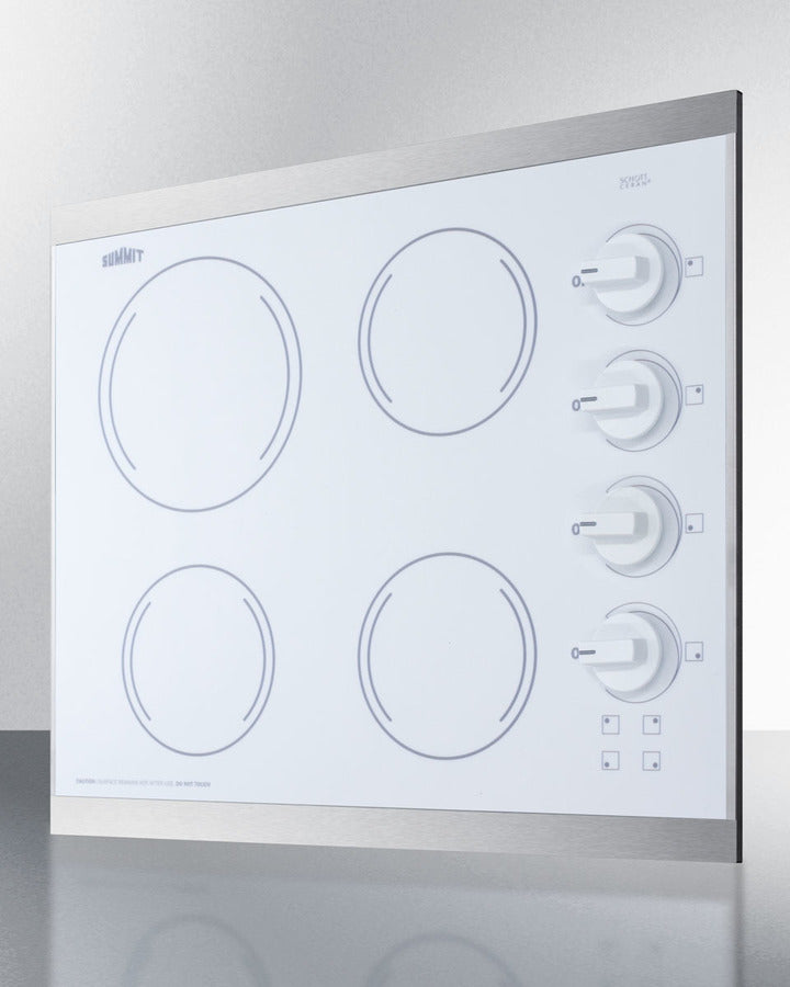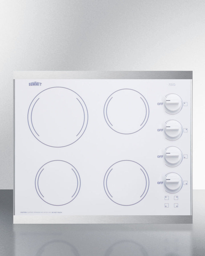 SUMMIT introduces a new series of smooth-top electric cooktops sized for 24'' wide kitchen counter spaces, all made in the USA with the industry's best elements.The CRS426WH is a 230V 5400W cooktop, with all burner elements made by E.G.O in Germany. This unit includes one large 8'' 1800W element to accommodate large cooking vessels and three 1200W 6 1/2'' burners to meet most heating needs. Push-to-turn safety knobs offer added safety, with an attractive black finish to complete the look. Each burner includes an indicator light.The smooth surface is made from ceramic Schott glass in a classic white finish, offering easier cleanup than traditional coil elements. The unit is framed with front and rear trim in 1'' thick 304 grade stainless steel for a professional look, with thin 304 grade trim on the sides for added reinforcement. The CRS426WH is designed to fit common cutouts sized at 22 1/8'' W x 18 5/8'' DDesigned and manufactured in the USA, the CRS426WH is the perfect way to finish any small kitchen space. For this unit in a black glass finish, see the CRS426BL.