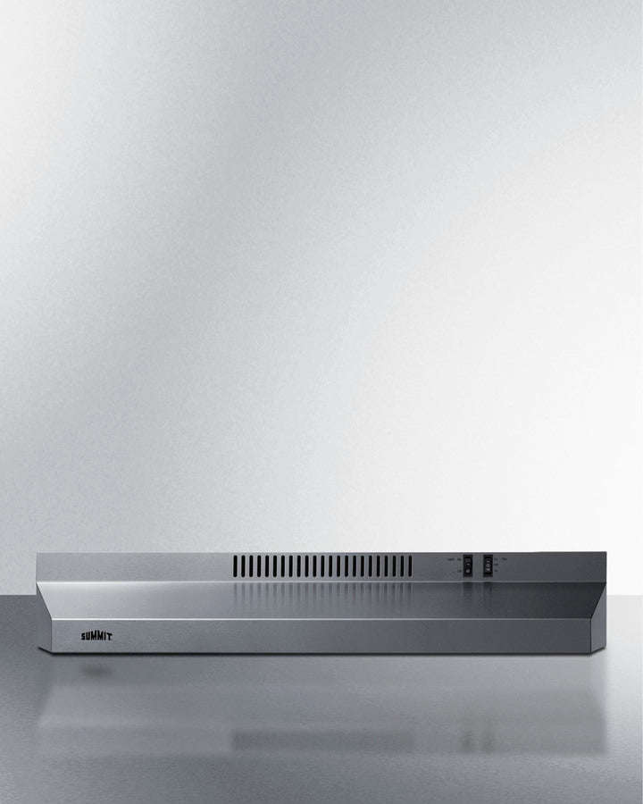Summit's under cabinet convertible range hoods offer versatile ventilation solutions for every kitchen space.Model H30RSS is a 30'' wide range hood ideal for apartments and other smaller kitchens. It features an attractive stainless steel finish with a horizontal grain. We include a pre-installed light bulb to illuminate your cooking surface. The 2-speed fan is easily managed by a rocker switch with a high and low ventilation setting. This hood is convertible for horizontal or vertical ducted ventilation or ductless/recirculating ventilation where no exhaust connection to the outside is available. It ships ready for standard 3 1/4'' x 10'' rectangular ducting, but it can be used with a round 6'' or 7'' duct with the addition of a transition (not included). We include a metal mesh filter to catch grease and a charcoal filter to absorb smoke and odors when using in recirculating applications. This unit does not include a power cord and is designed to be hard-wired by a licensed professional. Additional convertible range hoods are available in 18'', 20'', 24'', and 36'' sizes, with more styles and choices coming soon. We also manufacture an extensive selection of 30'' wide ranges and cooktops, providing complete kitchen solutions at incredible value. Browse the full Summit product line to explore your options.