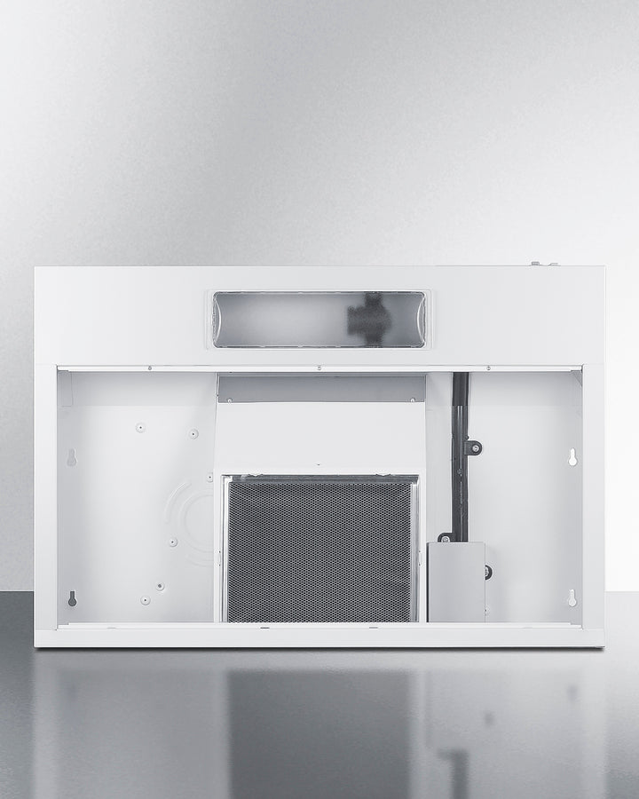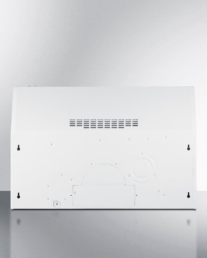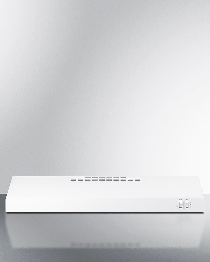 Made in North America, Summit's HC series under cabinet convertible range hoods offer versatile ventilation solutions for every kitchen space.Model HC30WW is a 30'' wide range hood ideal. It comes in a clean white finish constructed from 21 gauge galvanized steel for a clean look and durable design. The powerful 2-speed fan is easily managed by a rocker switch with a high and low setting. This unit can operate at 200 CFM for thorough ventilation. Airflow is directed upwards at a slight angle, ensuring smoke and odors won't blow towards the home chef.This hood ships for ductless/recirculating ventilation (where no exhaust connection to the outside is available) but is convertible for horizontal or vertical ducted ventilation (3 1/4'' x 10'' rectangular ducting or 7'' round, transition required). We include a combination aluminum mesh/charcoal filter to absorb grease, smoke, and odors. This unit accepts a standard light bulb (not included). Both the filter and lens cover snap in place, with no tools required to change out as needed. Note: this hood does not include a power cord and is designed to be hard-wired by a licensed professional. In addition to this range hood, Summit manufactures this series in additional colors, as well as shell hoods, wall-mounted European hoods, and island hoods in a range of styles. Browse the full Summit product line to explore your options.