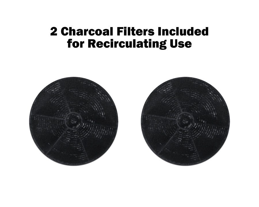 Two round carbon filters attach to the blower to absorb grease and odors when using the hood in recirculating mode