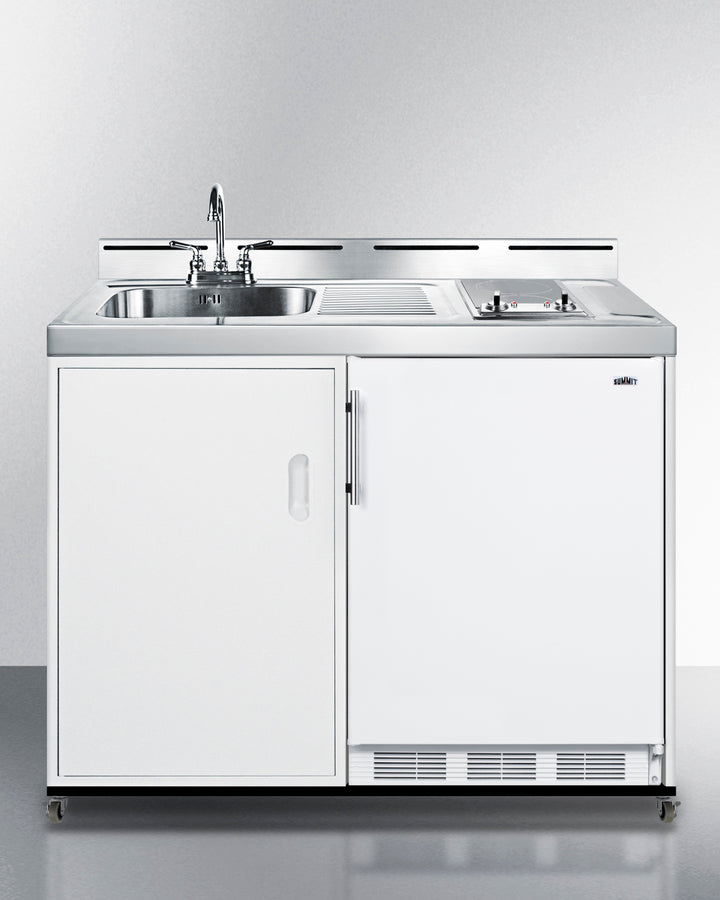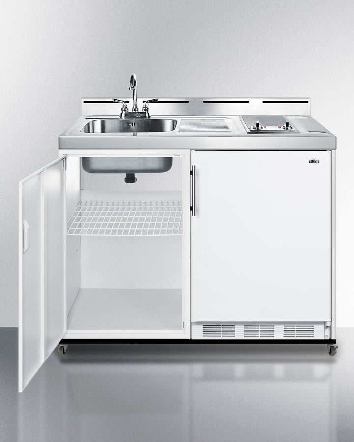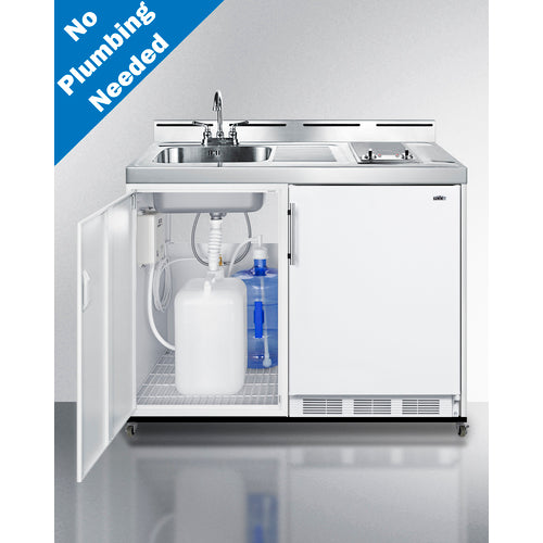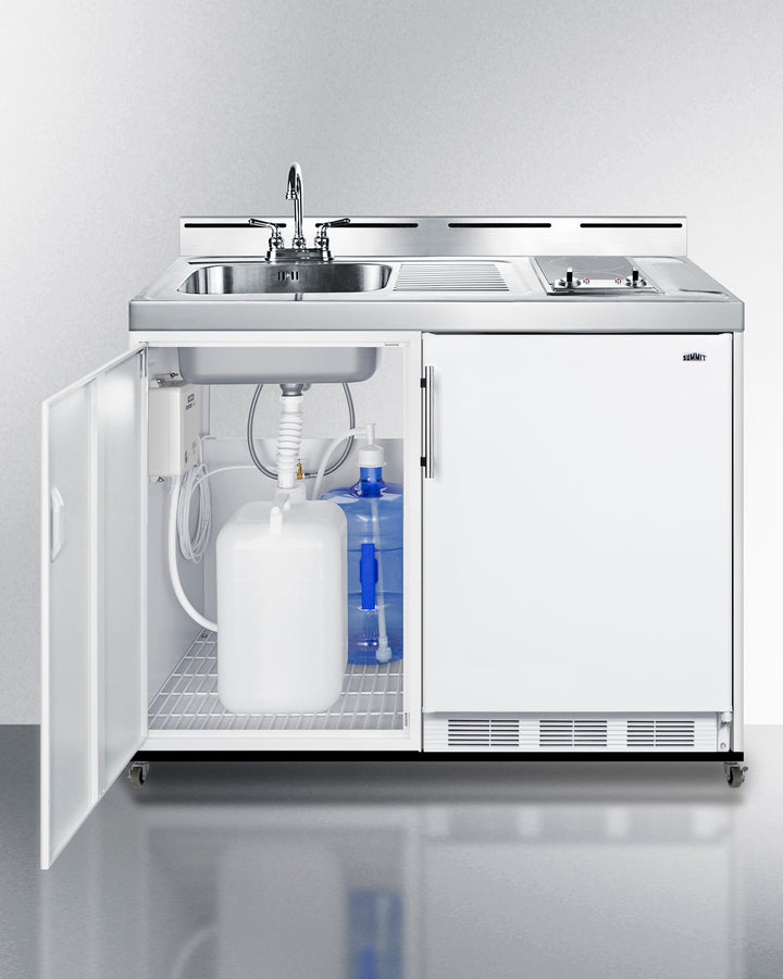 Includes a refrigerator-freezer, 2-burner cooktop, sink, and water pump kit to meet all of your basic kitchen needs