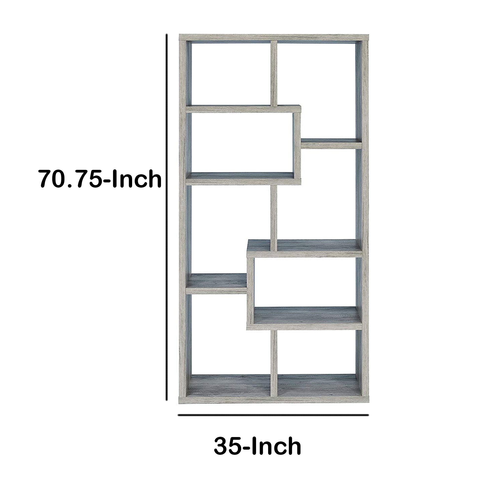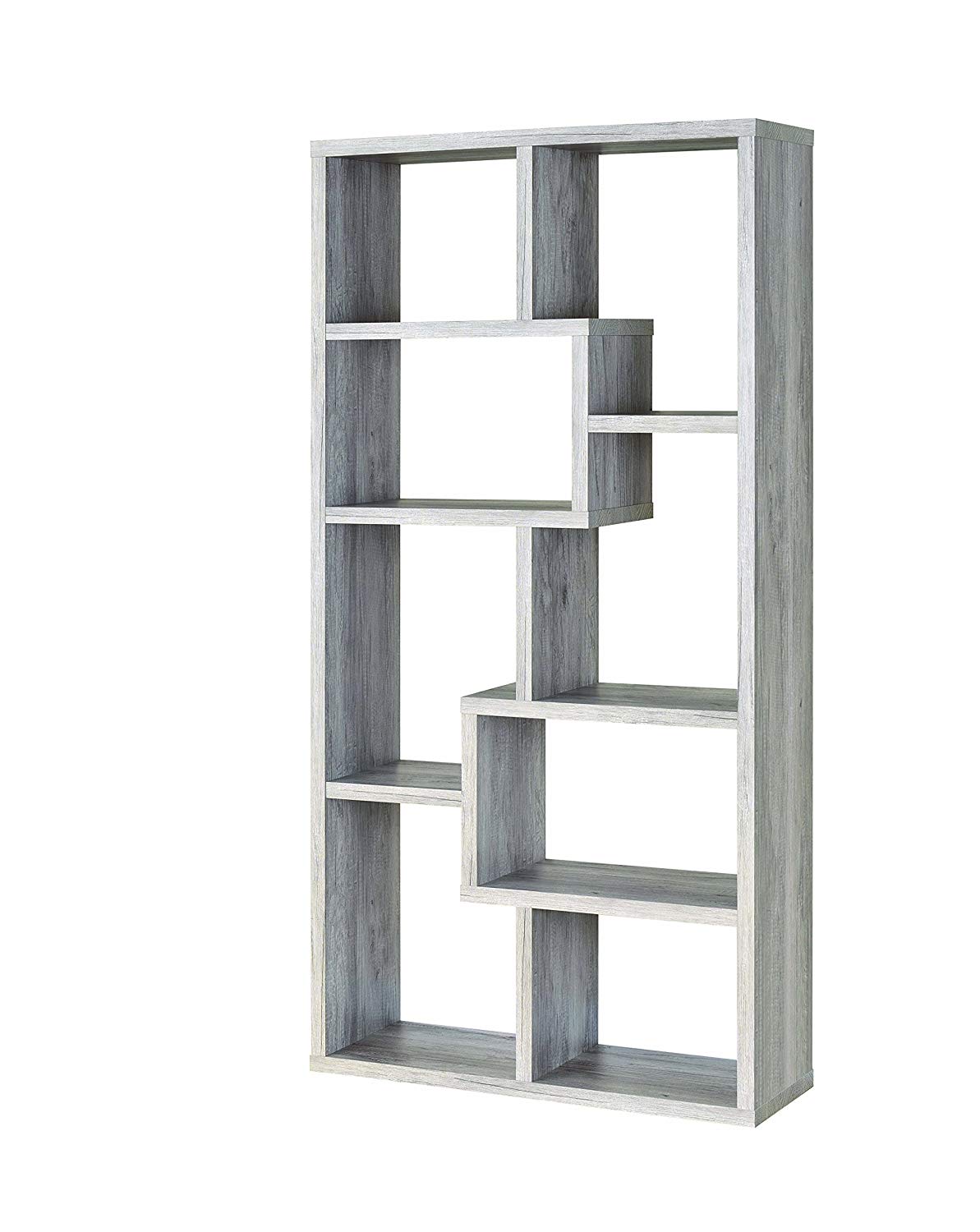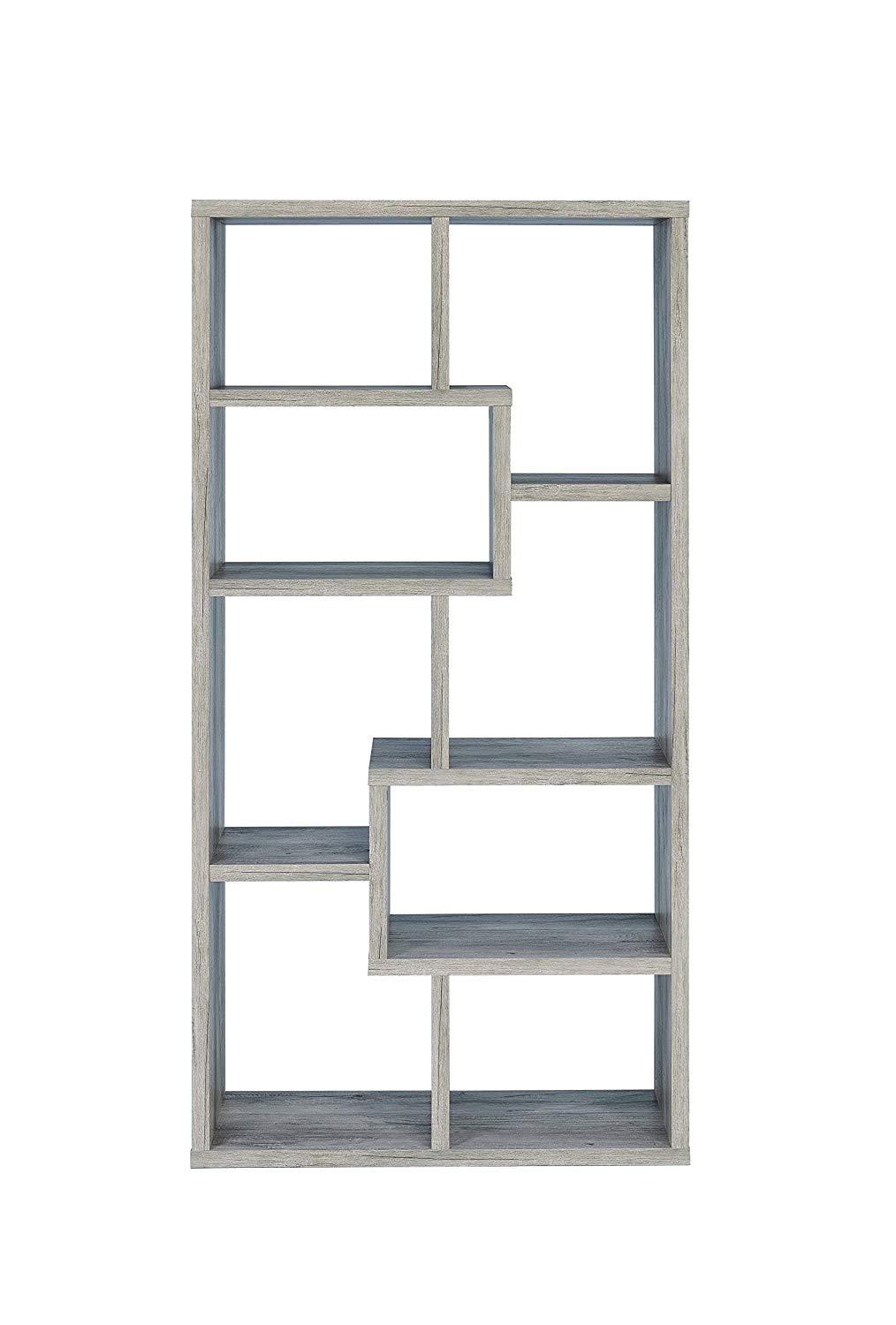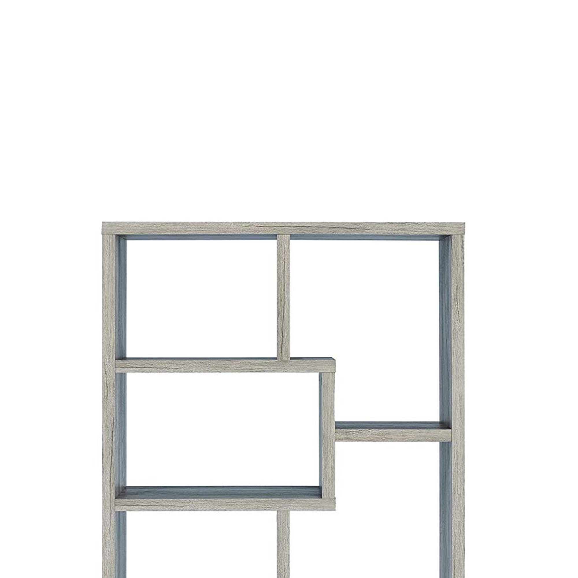 This casual style bookcase is constructed with high grade wood in and has plenty of storage space. This versatile piece features floating display cube shaped shelves. The sleek lines bring out the best features of the wood craftsmanship, which comes in a beautiful natural tone gray finish.