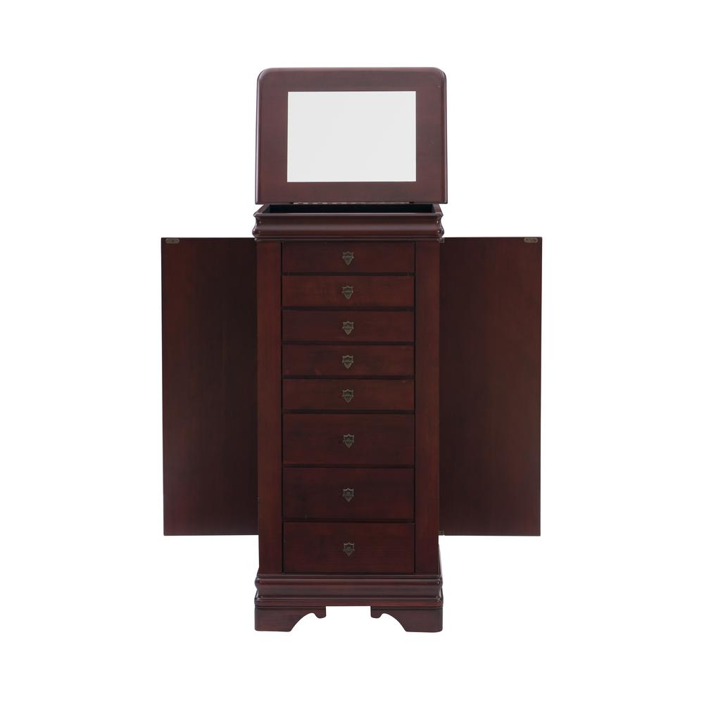 Free-standing jewelry armoire in Marquis Cherry finish is accented with classic Louis Philippe features. Flip-top mirror opens to a lined and divided jewelry compartment. Touch latch side doors swing open to reveal necklace hangers. Eight lined drawers for jewelry and accessories. Lining is plush black and drawer pulls are shaped as a shield of honor in antique brass finish. Minimal assembly, attach top only. Product Specs: