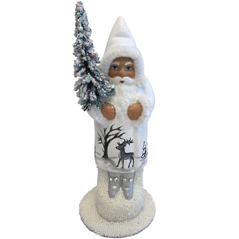 Schaller Paper Mache Candy Container - Santa Claus with White Coat with Reindeer Product Specs: Product Height: