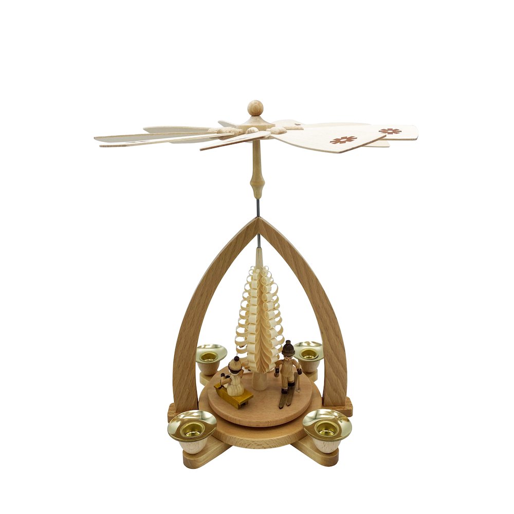 Richard Glaesser natural finish pyramid - a centered Christmas tree surrounded by playing children - made in Germany. Uses #29314W white - #29314N natural - or #29314R red candles. Heat rising from candles turns paddles and base.