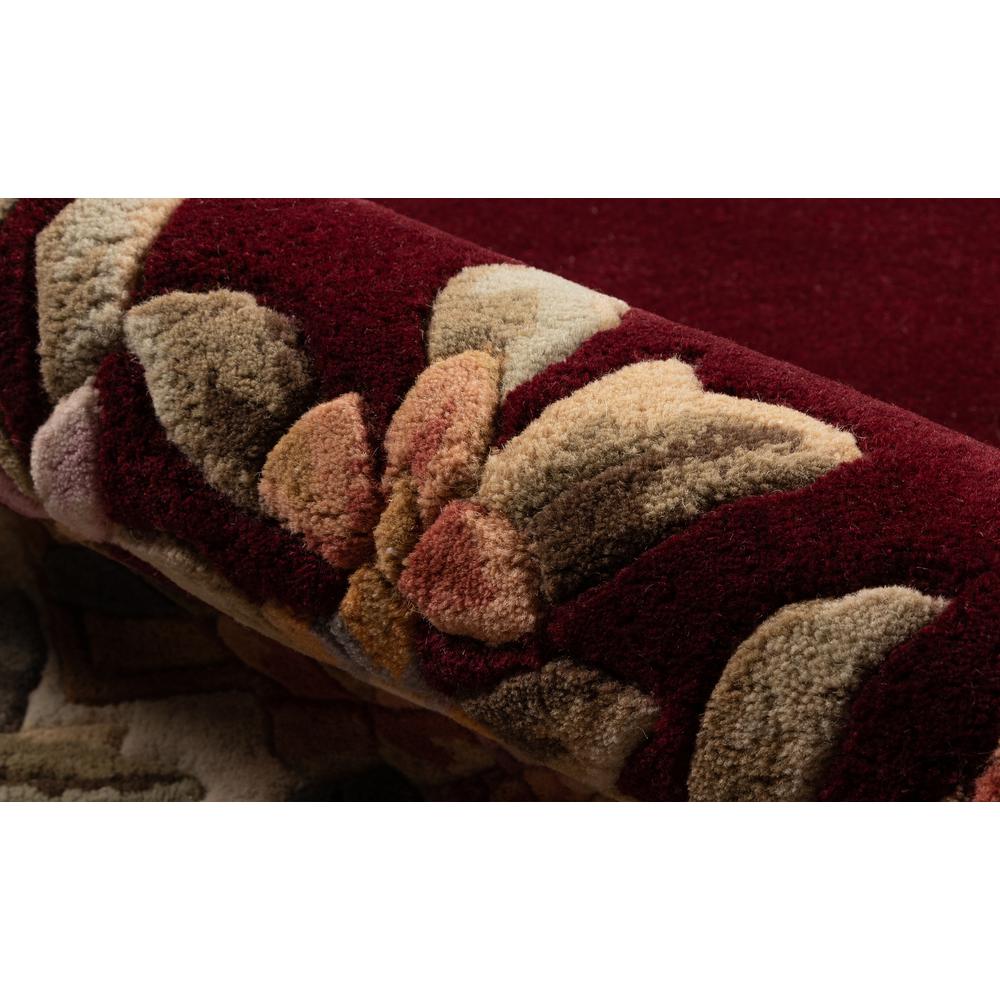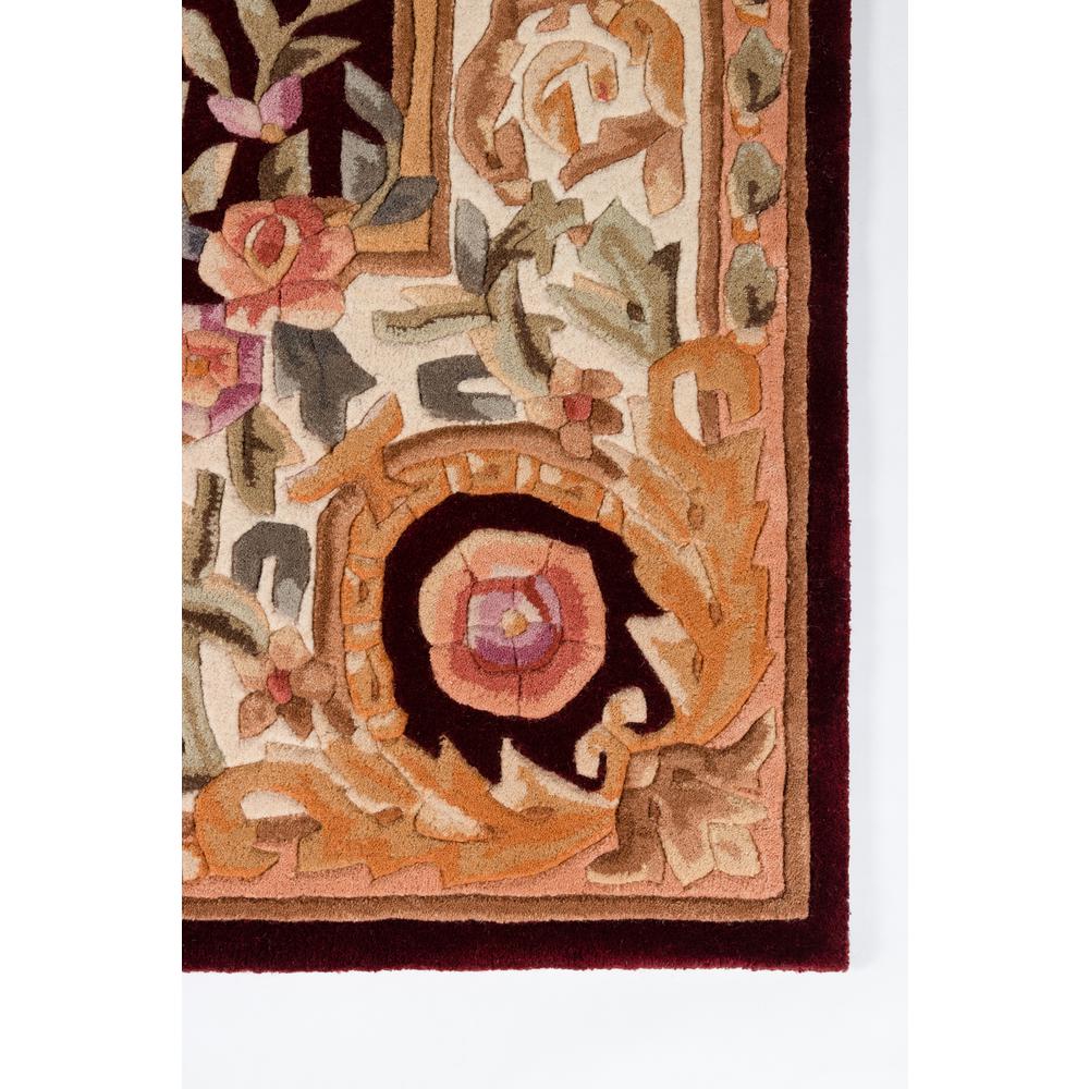 The antique-style embellishment of this traditional area rug adds ornamental flourish to floors throughout the home. Available in royal shades of sage green, soft blue, ivory, rose and regal burgundy red, the ornate gold scrolls and scallops of each decorative floorcovering reflect the gilded grandeur of French baroque style. Hand tufted from 100% natural wool fibers, the curling vines and lush floral bouquets of the borders are hand carved for exquisite depth and dimension. Product Specs: Product Height: