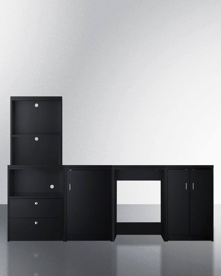 Sleek black laminate finish on the cabinet pieces suits any setting