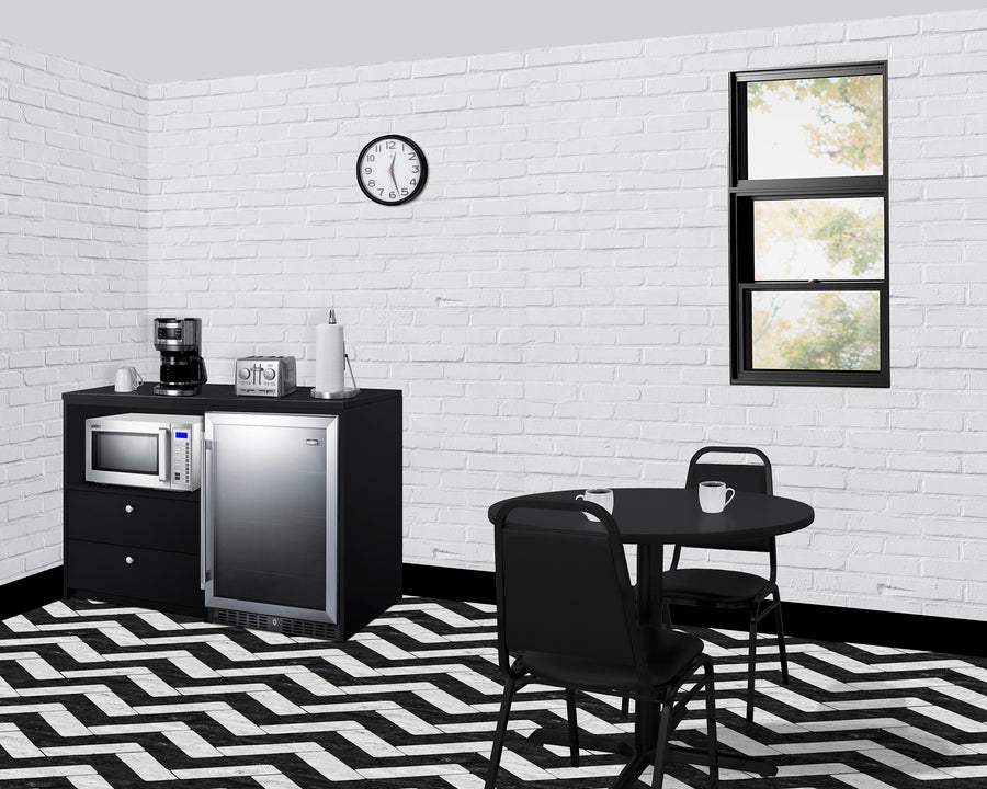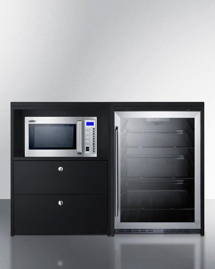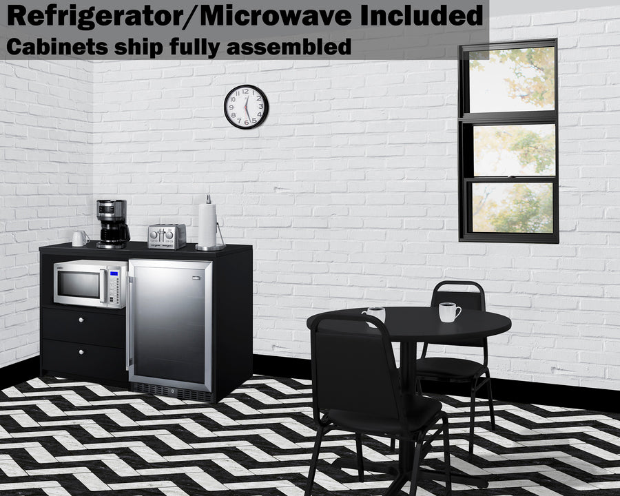 Summit's selection of American-made casework brings new convenience to break room design with fully assembled cabinetry that lets you create the perfect coffee station, office lounge, or refreshment center.The CWSUITE52G is comprised of four pieces: refrigerator cabinet (model CWR4ADA), Summit AL57G beverage center, storage cabinet CWM2ADA, and commercial microwave SCM1000SS. The cabinetry ships full assembled and individually packaged, allowing you to rearrange the layout to best suit the needs of your space. The cabinet height is 34'' in order to comply with ADA guidelines for accessibility. Each cabinet piece is manufactured in the USA from engineered wood in a jet black laminate finish. The CWM2ADA cabinet includes two slide-out drawers and a cutout to house the microwave or another small appliance. It features a pre-installed hole in the rear to let you run power cords through, accommodating the microwave as well as other small appliances, such as coffeemakers or toasters. The SCM1000SS microwave is approved to NSF commercial standards and features a flat bottom without a turntable. Beverage center AL57G offers a full 5 cu.ft. of storage capacity, with no-frost operation, digital temperature control, adjustable glass shelves, and LED lighting. It comes with a user-reversible stainless steel trimmed glass door and front lock. In addition to this suite design, Summit offers more styles and sizes. You can also build your own by combining any combination of our modular casework cabinets and appliances. All furniture ships fully assembled. Browse the full Summit portfolio to create the perfect solution for break rooms, schools, welcome lounges, and more.