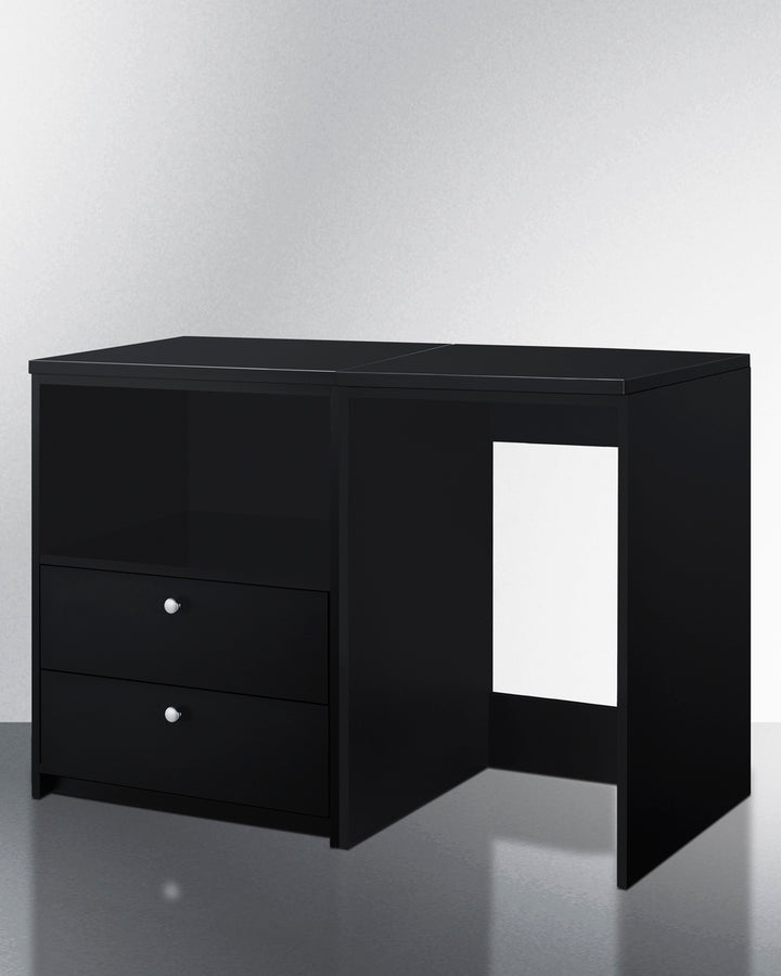 Sleek black laminate finish on the cabinet pieces suits any setting