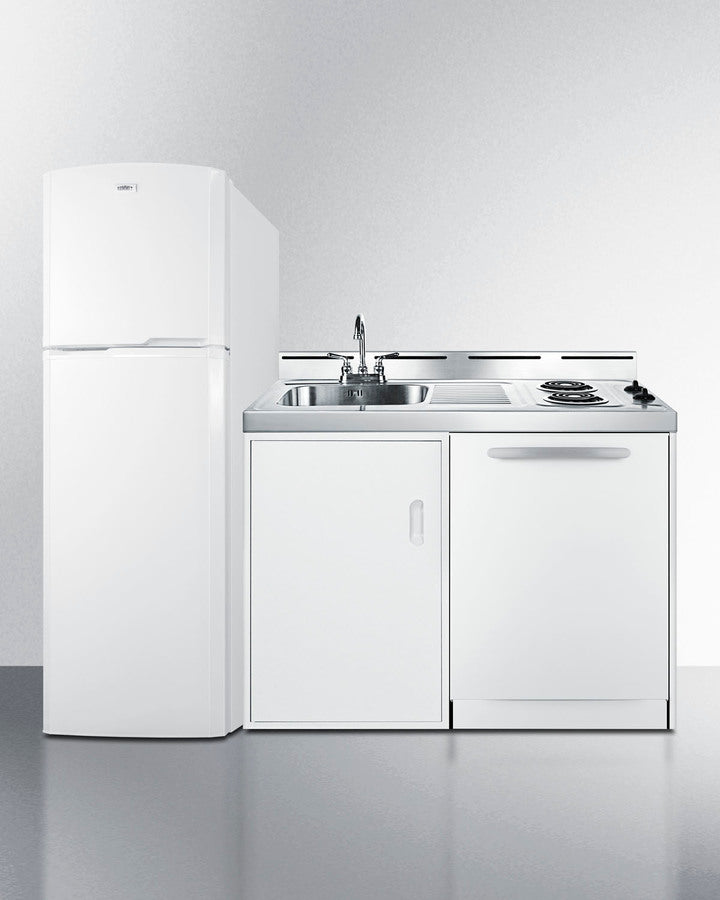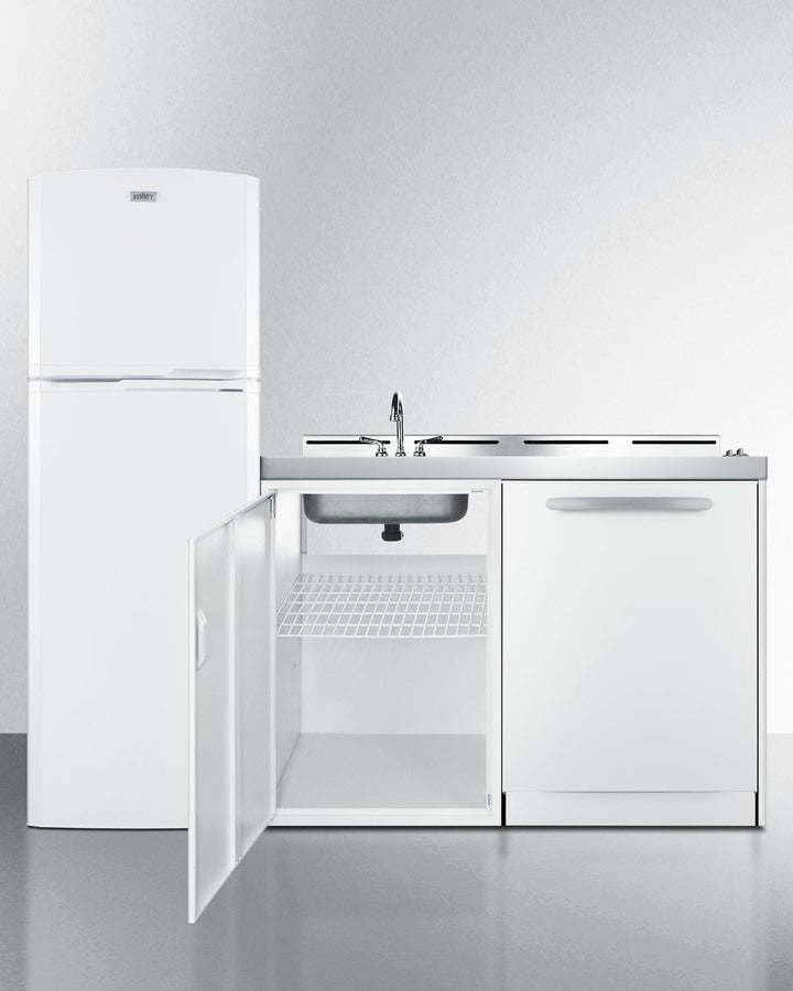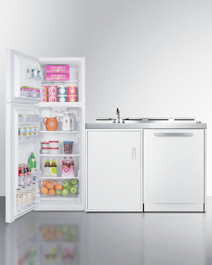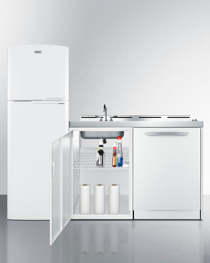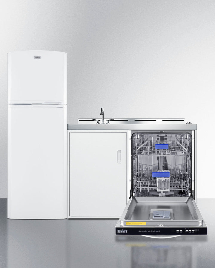 Includes a full-sized refrigerator-freezer, 24'' dishwasher, 2-burner cooktop, sink with faucet, and storage cabinet