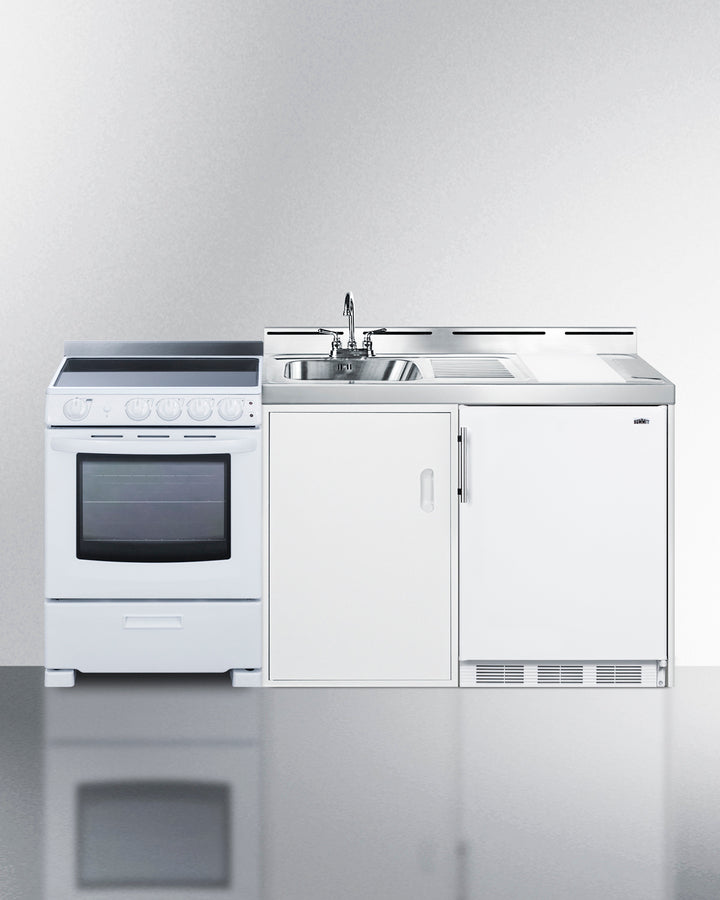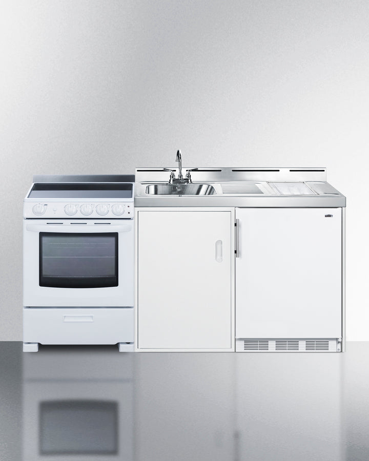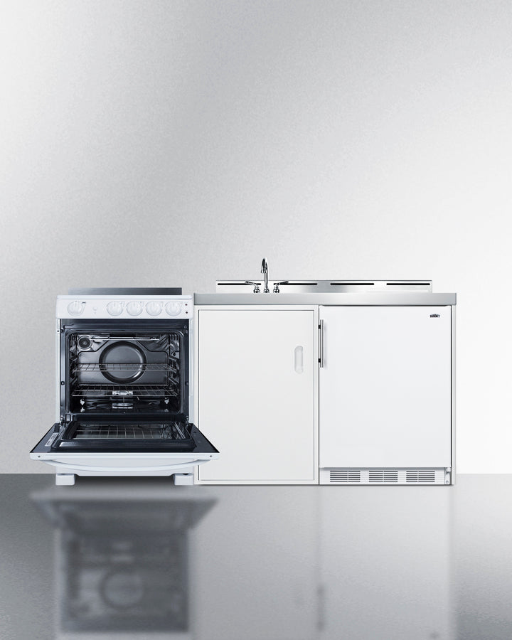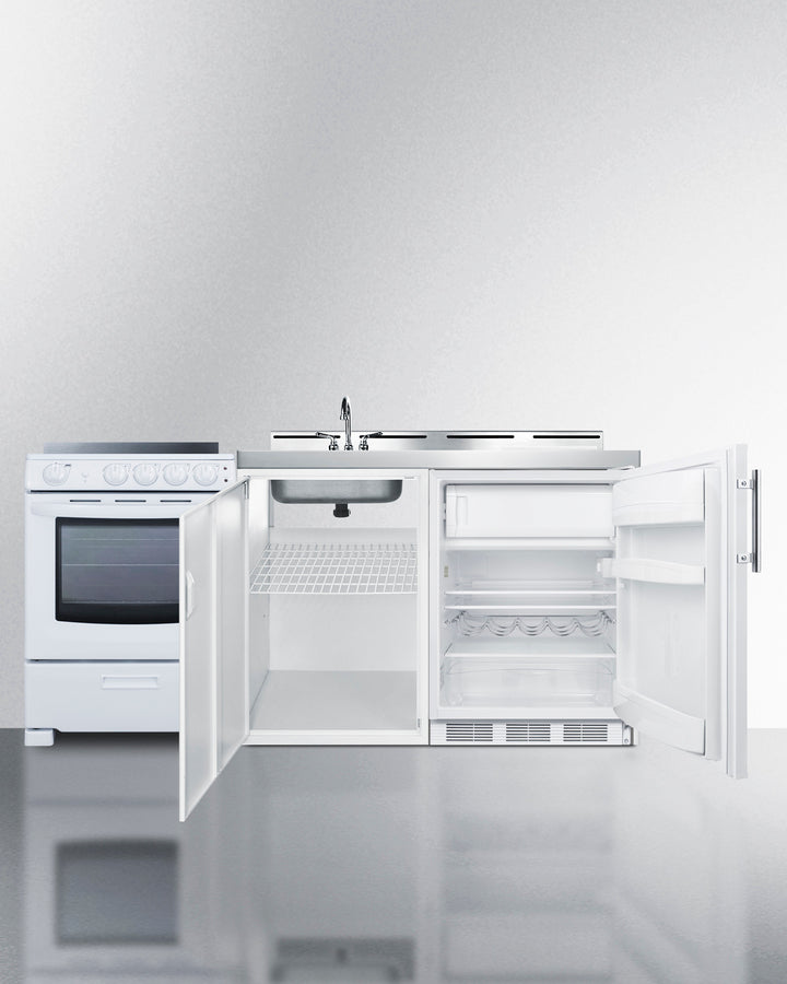 Summit's line of all-in-one combination kitchenettes brings complete kitchen convenience in a slim-fitting design. These units come fully featured with everything you need for the home foodservice experience, including a refrigerator with a freezer compartment, 4-burner smooth top range with oven, sink with faucet, cutlery bin with a removable cutting board cover, and storage cabinet for dry goods. The ACK72ELSTW is a 54'' wide kitchenette with an easy-fitting 24.25'' depth. This unit comes with a stainless steel countertop offering durability in a professional look. The surface includes a small cutlery bin, with a removable cutting board cover to ensure easy food prep. The compact sink features a ready-to-use faucet. Underneath the sink is a large cabinet with a removable shelf for added storage convenience.Unlike many other brands' kitchenettes, all Summit units include a refrigerator with a freezer compartment to cover all of your cold storage needs. The ACK72ELSTW includes the CT661W, with 5.1 cu.ft. of storage space. A dual evaporator system separately cools the auto defrost refrigerator section and manual defrost freezer compartment for improved overall performance. This model includes adjustable glass shelves, door storage, a scalloped wine shelf, and crisper. The ACK72ELSTW also ships with Summit REX2421WRT, a 24'' wide 220V electric range complete with a smooth-top 4-element cooking surface and a full oven compartment with a bake and broil function. This range includes a large window with interior oven light, adjustable slide-out oven racks, hot surface indicator lights for added safety, and a pull-out drawer for storage as needed. The range can be installed on the left or right side of the kitchenette.The ACK72ELSTW is shipped on one pallet, with the kitchenette and refrigerator fully assembled and the range packaged separately. Perfect for studio apartments, hotel rooms, dormitories, assisted living facilities, temporary kitchen facilities, and any other location in need of a low maintenance, fully-featured compact kitchenette.