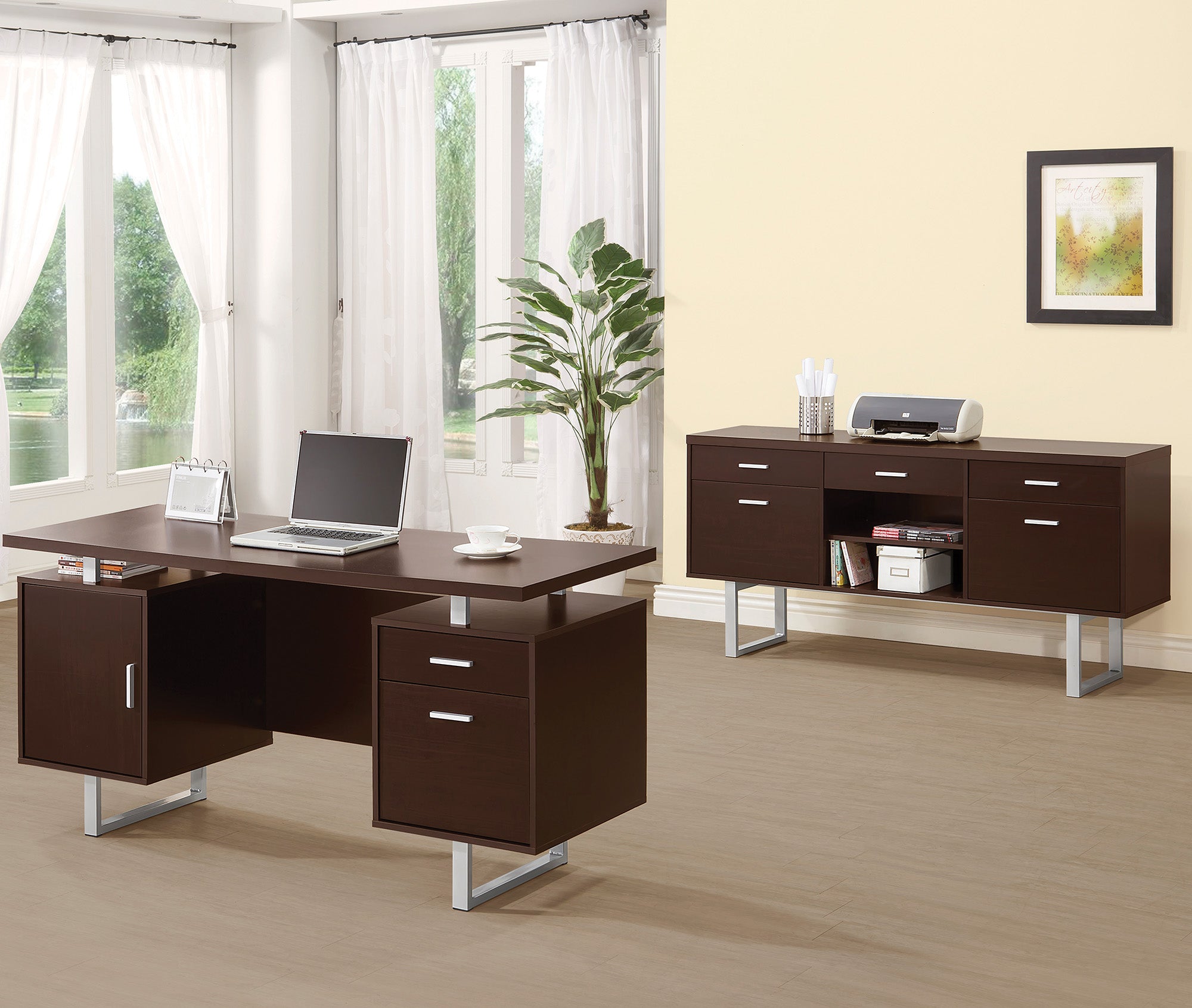 The floating style desk top adds a spacious bonus shelf that extends just under the footprint of the top of the desk. For storage, the desk offers space within a door on one side and within two drawers on the other side. A rich cappuccino(brown) finish and silver-power coat finish sled legs and modern bar handle hardware add up to a great look for a contemporary home office.