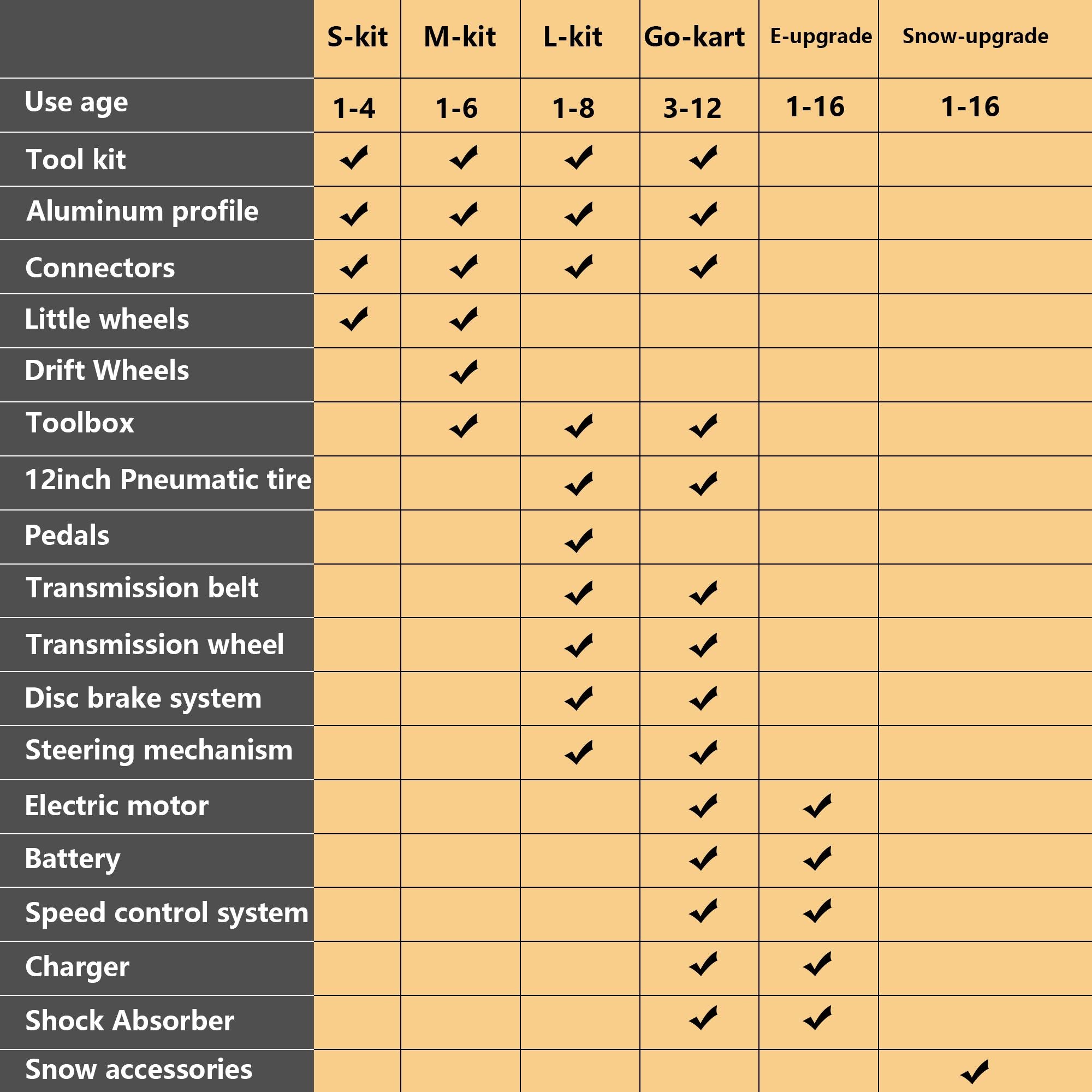 The perfect gift for kidsDesigned by a young team at a diverse technology company, the product is an innovative modular toy. Parents can assemble and play with their children and enjoy an interesting experience. Such interesting products can infinitely stimulate children's imagination and creativity.Variety ToysL-kit contains M-kit, suitable for children aged 1-8. Adopt simple modular design, so more creative new combinations can be realized, at least 20 different S-kit/L-kit vehicles or 20 L-kit forms, including two-wheeled bicycles, three-wheeled bicycles, go-karts, two-wheeled Balance car, three wheel balance car, two wheel scooter, three wheel scooterSafety and environmental protectionThis product is safe and environmentally friendly, and has obtained CPC certification. It adopts high-strength aviation aluminum alloy profiles and BASF environmentally friendly nylon plastics, and stainless steel connectors as the main components, which are corrosion-resistant and have a long service life. It also includes polymer rubber pad disc brake system, gear belt transmission system, and 12-inch pneumatic tires to ensure safe, comfortable, stable and efficient driving.Simple operationThe package is equipped with a well-matched special tool box, including special pliers, high-hardness hexagonal wrench, wrench extension tube, etc., so that you can immediately install your favorite toy, ensuring the simplest and most efficient assembly processSustainable modular designThis product offers a sustainable solution with a modular design concept that simply transforms together when the child grows up, or can be upgraded to fit at any time by adding an upgrade pack. Scooters, bikes, trailers and go-karts can also be upgraded to electric mode, or can use more electric motors to provide more power. This product is suitable for almost all minors.